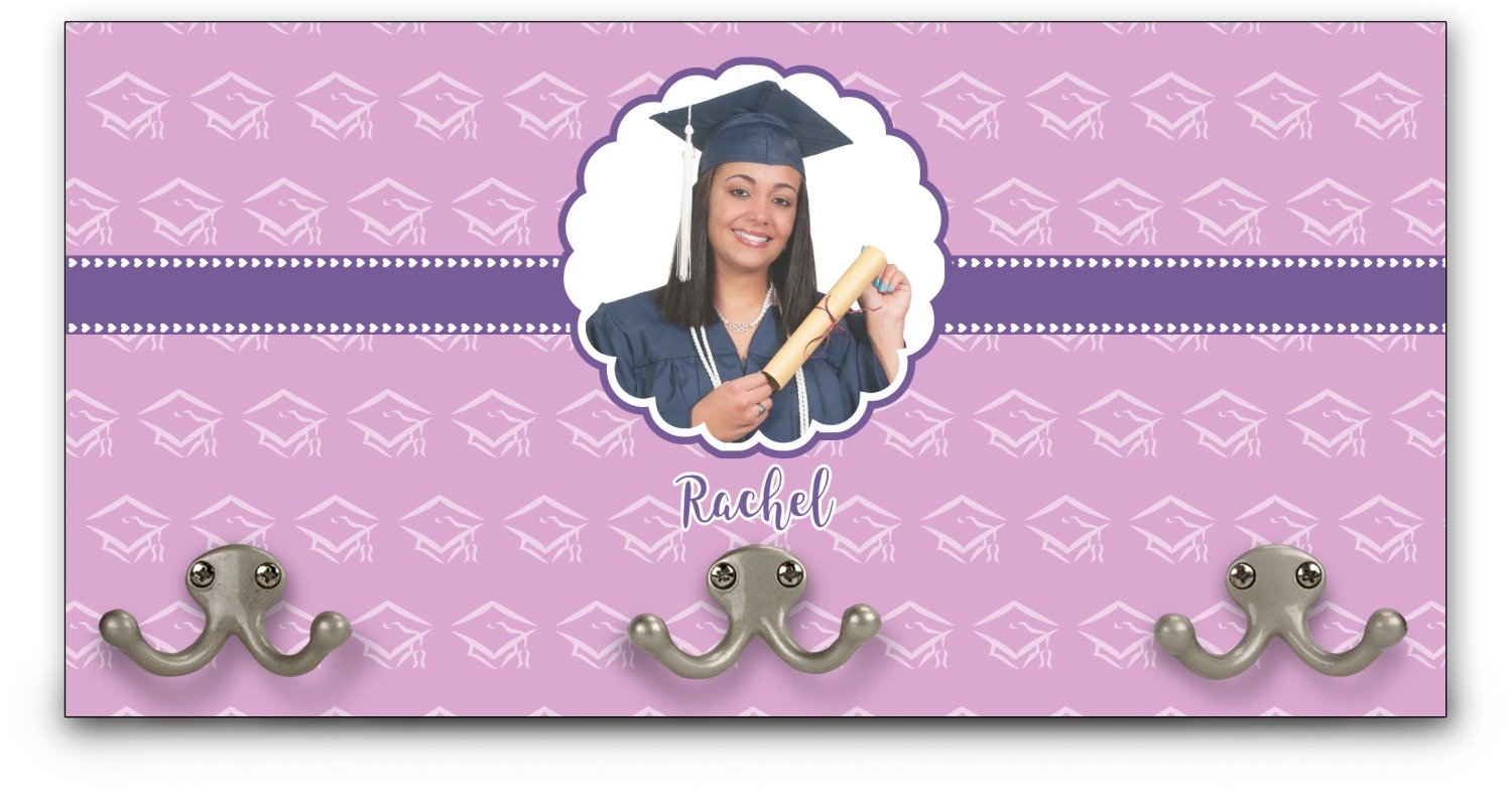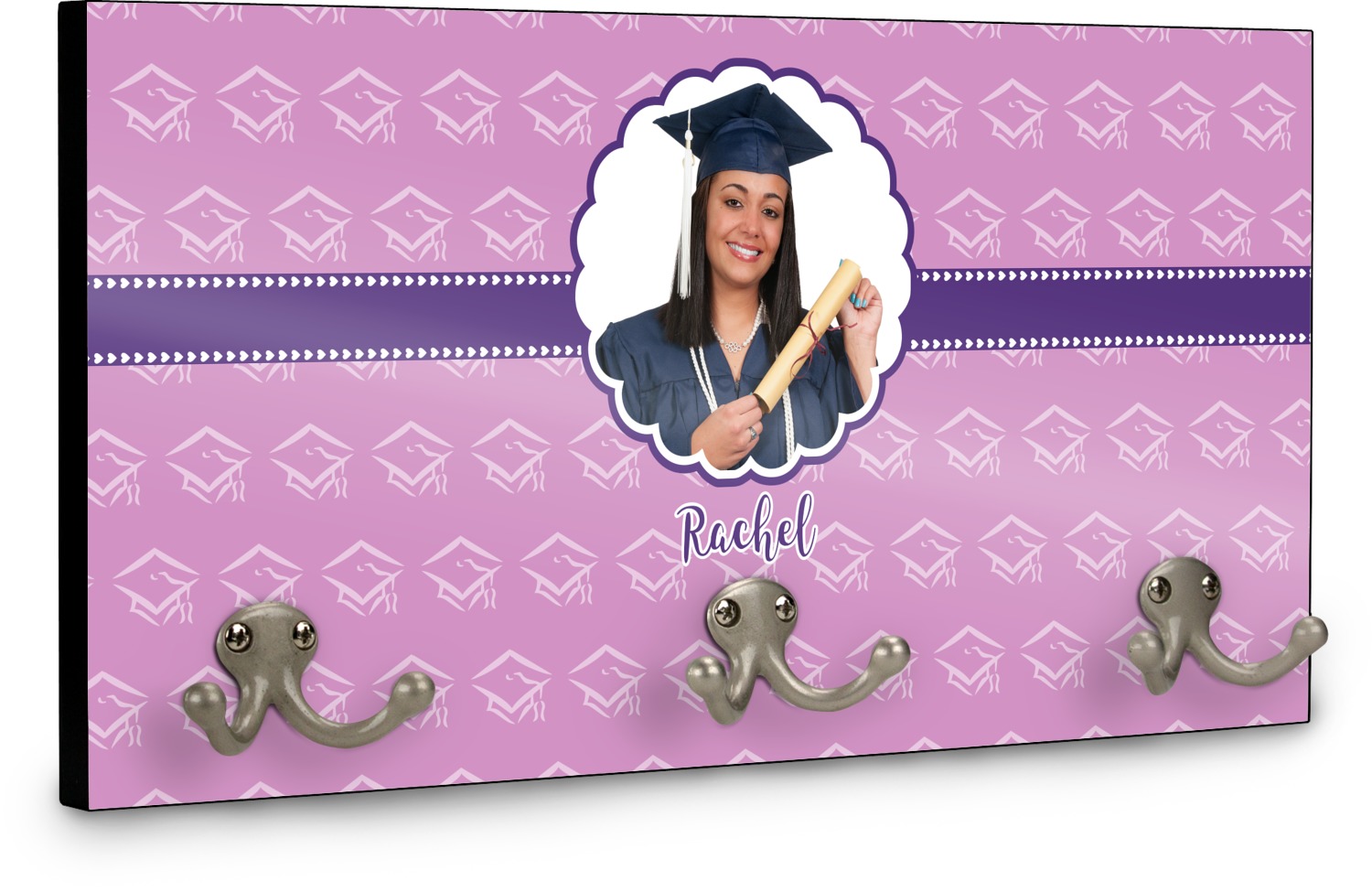 This coat rack is the perfect way to add some personality to your wall or entryway. The board is made of a strong maple that is approximately 16" x 8". The three 2-prong hooks are a sturdy metal that have three screws attaching them to the board. Your design is printed right onto the front of the board while the back and sides are a simple black.