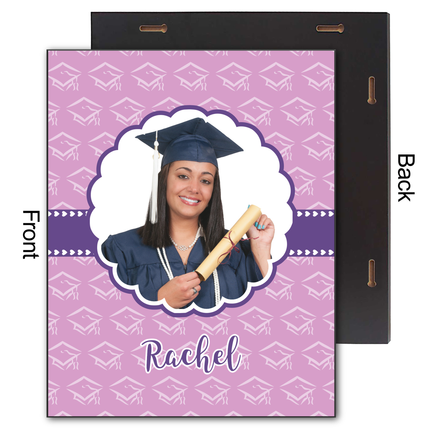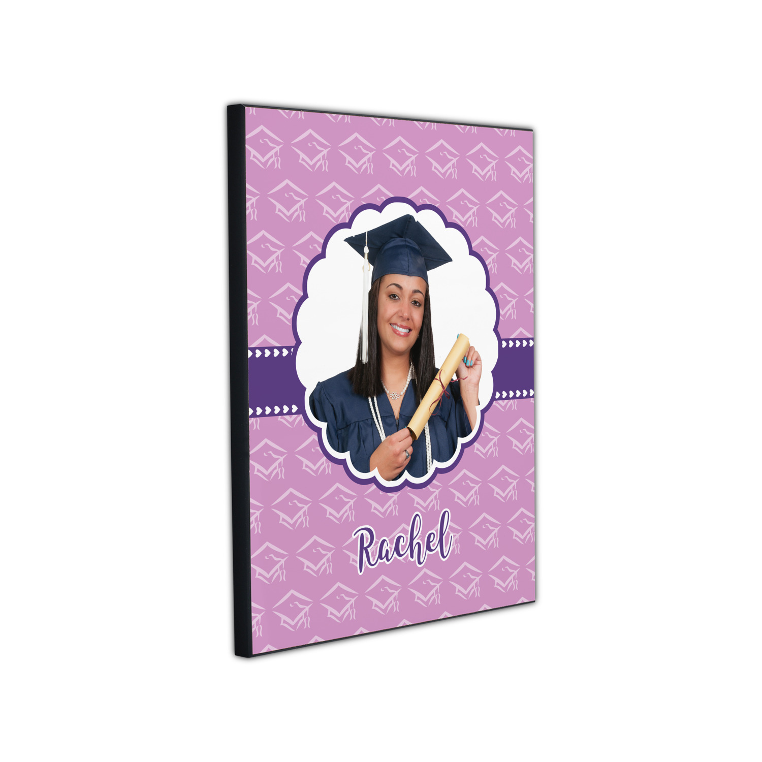 For our design, we chose a mortar cap background in violet. We then layered it with a heart ribbon and a photo / text personalization style. We chose the scalloped label for our female graduate and added her name. There are many other graduate patterns in our system including patterns for math, science, physics etc., so you can easily customize it for you graduate. We also have more masculine ribbons & labels for you male graduate!