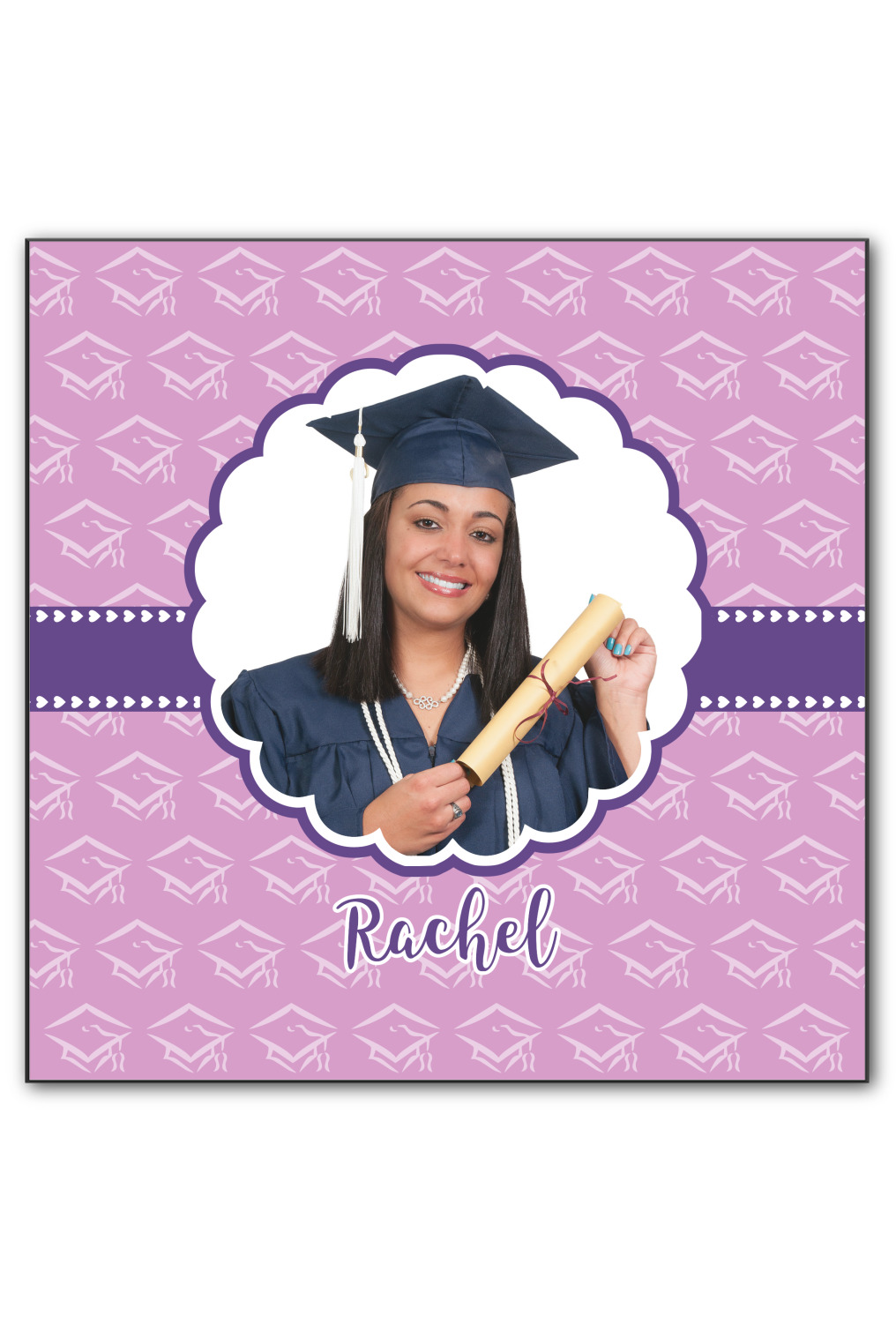 For our design, we chose a mortar cap background in violet. We then layered it with a heart ribbon and a photo / text personalization style. We chose the scalloped label for our female graduate and added her name. There are many other graduate patterns in our system including patterns for math, science, physics etc., so you can easily customize it for you graduate. We also have more masculine ribbons & labels for you male graduate!