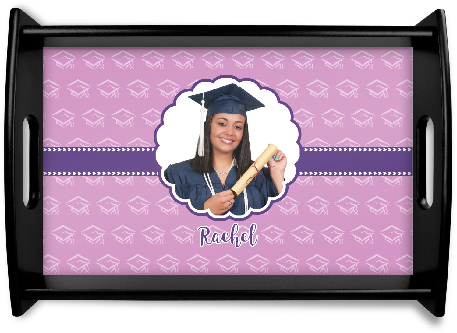 This serving tray with handles features square edges and two rounded sides, creating a very modern look. Each side is fabricated from a beautifully cut, natural wood. The bottom of the interior of the tray displays your customized design in bright, vibrant color. The tray is sold in both a black color and a natural wood look. Each variation of the wood serving tray has two sizes: Small, which is 14" x 10" x 2.25", and Large, which is 19.5" x 13.5" x 2.75".