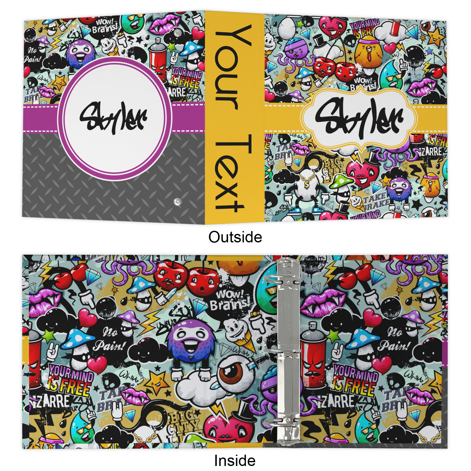 Made from a sturdy cardboard base with a full high quality canvas textured vinyl wrap with the design of your choice. Unlike our standard 3-ring binder with the full wrap design your artwork wraps from the front and back and into the inside of the binder.