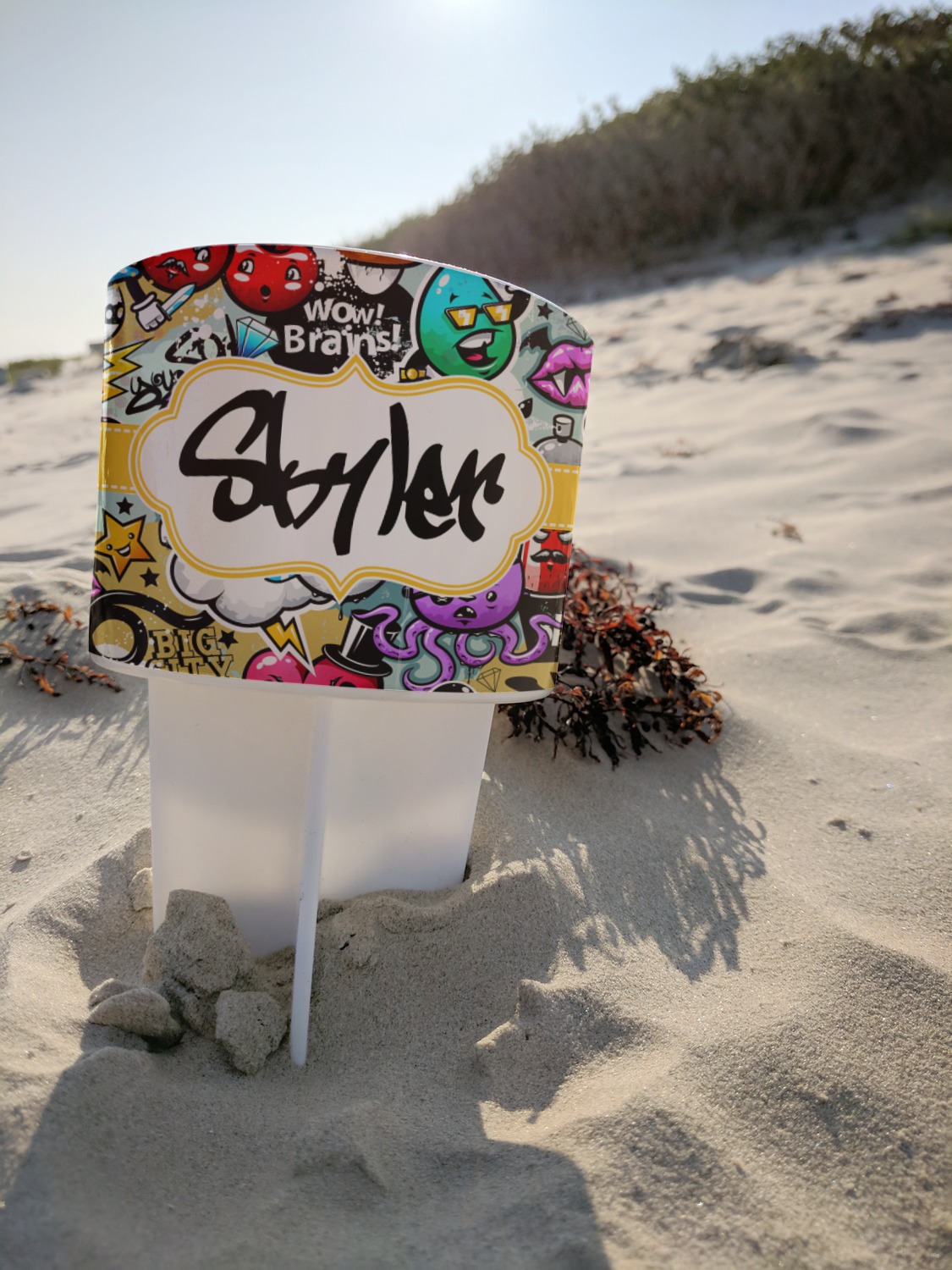 This cup holder has a large stake at its bottom that anchors it to the sand or ground below, while the cup holder rests above the stake. The entire drink holder is made of durable plastic and displays your customization around the cup holder portion. We sell these personalized beach spikers in two different colors: black and white.