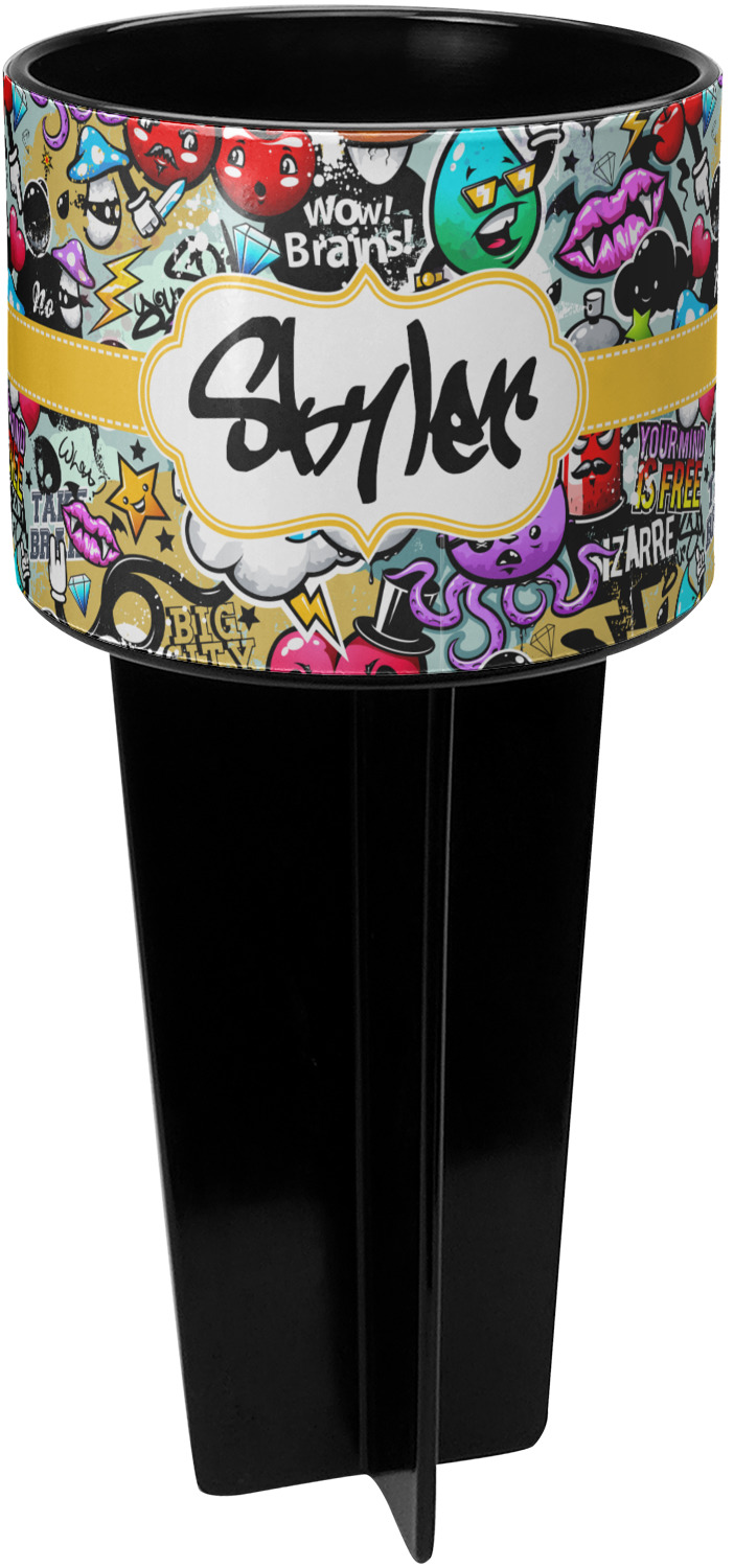 This cup holder has a large stake at its bottom that anchors it to the sand or ground below, while the cup holder rests above the stake. The entire drink holder is made of durable plastic and displays your customization around the cup holder portion. We sell these personalized beach spikers in two different colors: black and white.