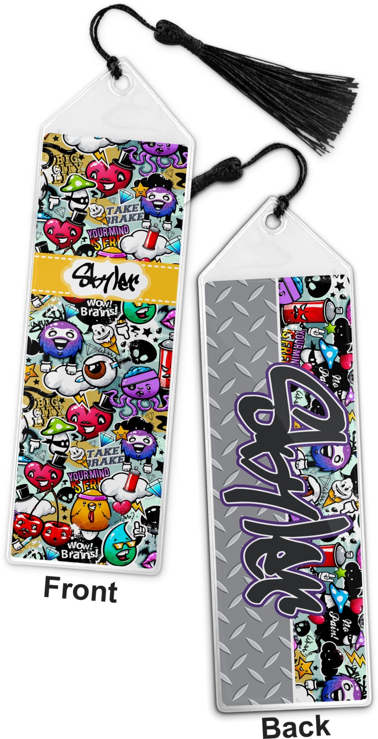 Your personalized bookmark is made of a sturdy, clear vinyl, and is approximately 7.5" x 2.25". We display your personalization on vinyl inserts that are placed on both sides. Accompanying each book marker is a black, fringe tassel that attaches to the reinforced, triangular header.