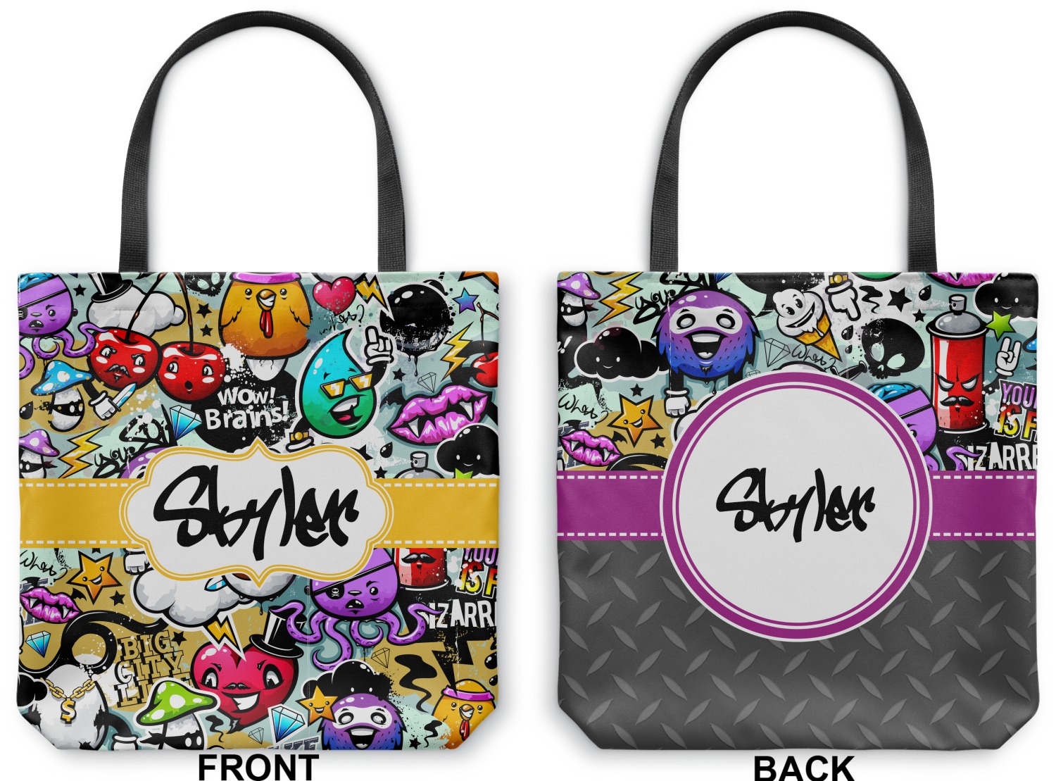 Our totes are made right here in the USA. Your design is printed on canvas fabric; the fabric is then cut and sewn on the sides and on the bottom to add an approximately 3.5 inch gusset. Black cotton handles are sewn in and reinforced. Your tote has a designs on both sides - the designs can be the same or different - the choice is yours. The inside of the tote has a black fused lining.