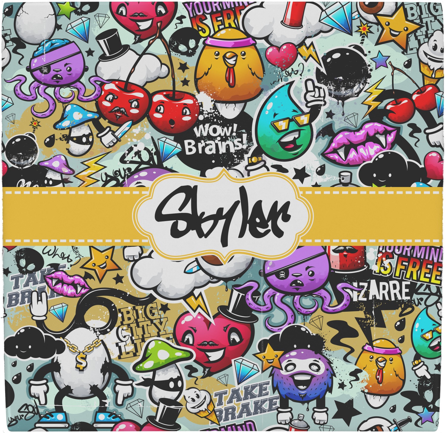 To personalized this design, we have added a ribbon with stitching along with a decorative label for your own text or name in a graffiti font!