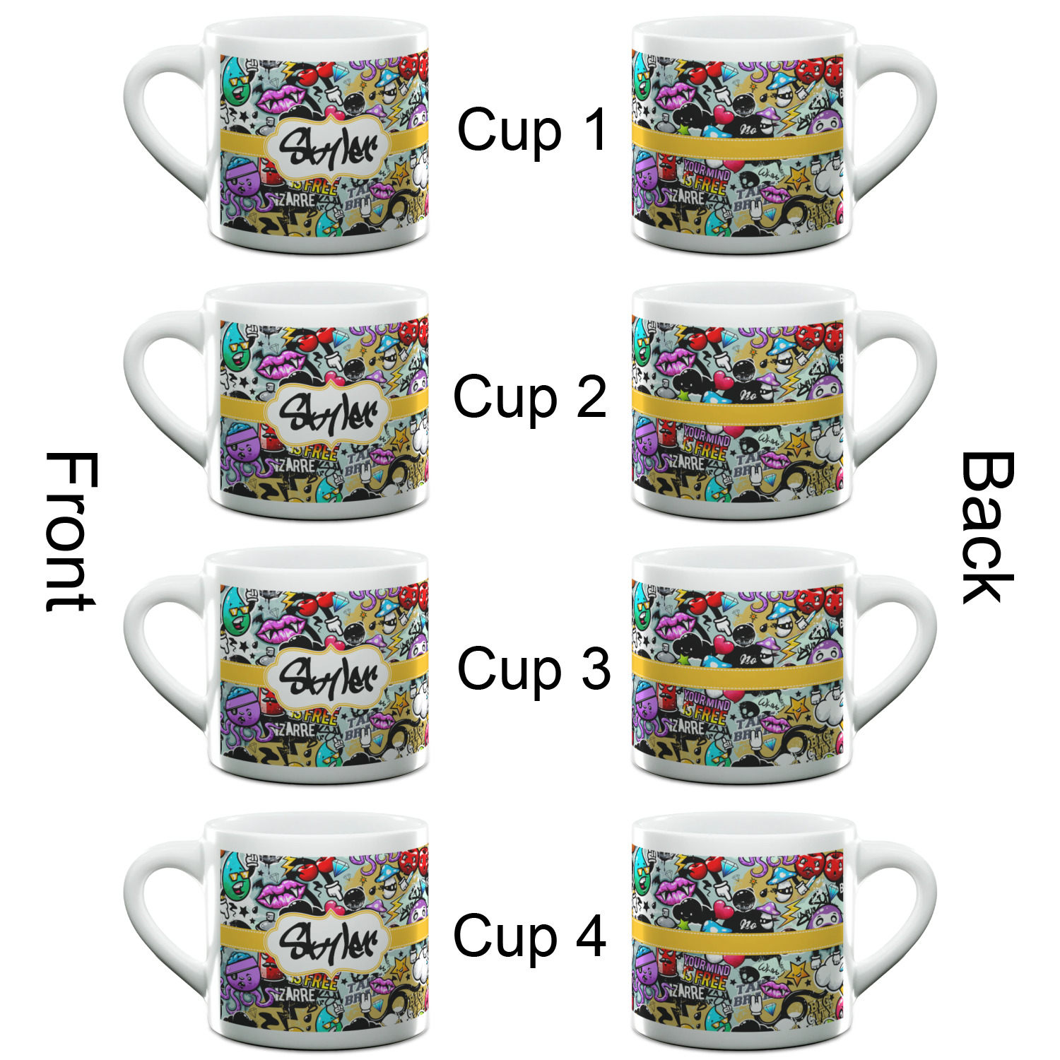 Each of our espresso mugs is a ceramic material sure to keep your drink warm. Personalize one cup for yourself, or order a set of 4! Its the perfect little gift for any coffee lover! We carry two sizes for you to personalize - 3 oz. (approx. 3.25" x 2.325" x 2.625") or 6 oz. (approx. 4" x 2.9" x 2.9"). Our 3 oz. mug is perfect for that single shot espresso while our 6 oz. mug can be your next favorite cappuccino cup holding two shots of espresso!