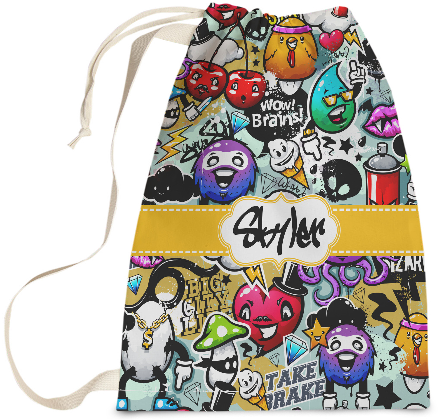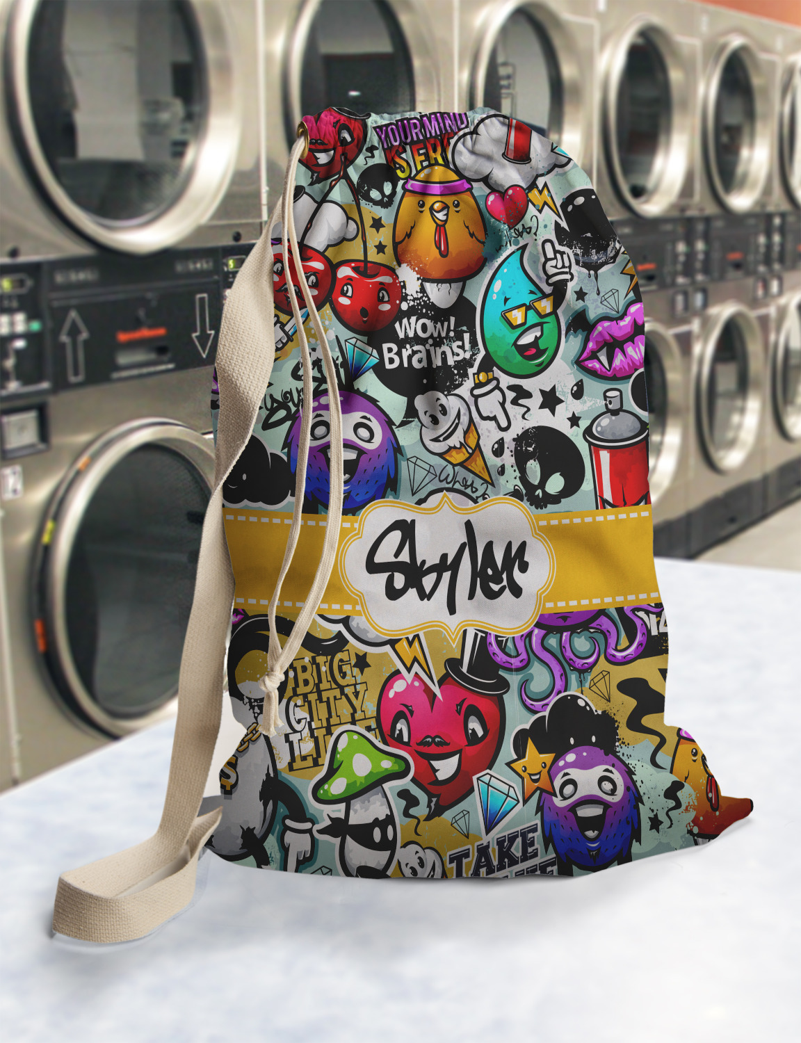 Carry your laundry in style with these customized laundry bags. Available in two sizes, featuring a natural colored woven strap and a cinch cord, these bags hold a lot of clothes or anything else you want to fit in them.