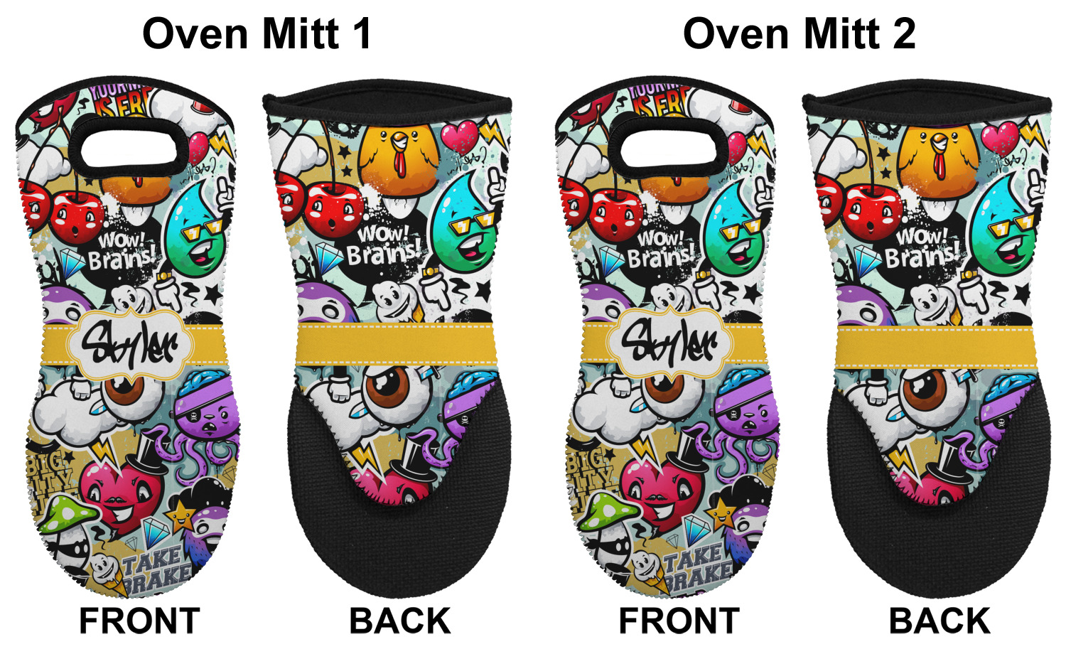 These heat resistant gloves are made entirely of a durable neoprene; the front features a softer texture, while the palm's side has a textured surface, meant to handle heat up to 500 degrees Fahrenheit. Thick, heavy duty stitching connects the two sides. A small, oval cutout appears on the front, and can be used to hang and store the mitt. Your personalization appears on the front, and the upper part of the back of the mitt. The style of these oven mitts are suitable for both the right and left hand, depending on your needs. If you need one for each hand, be sure to order two!