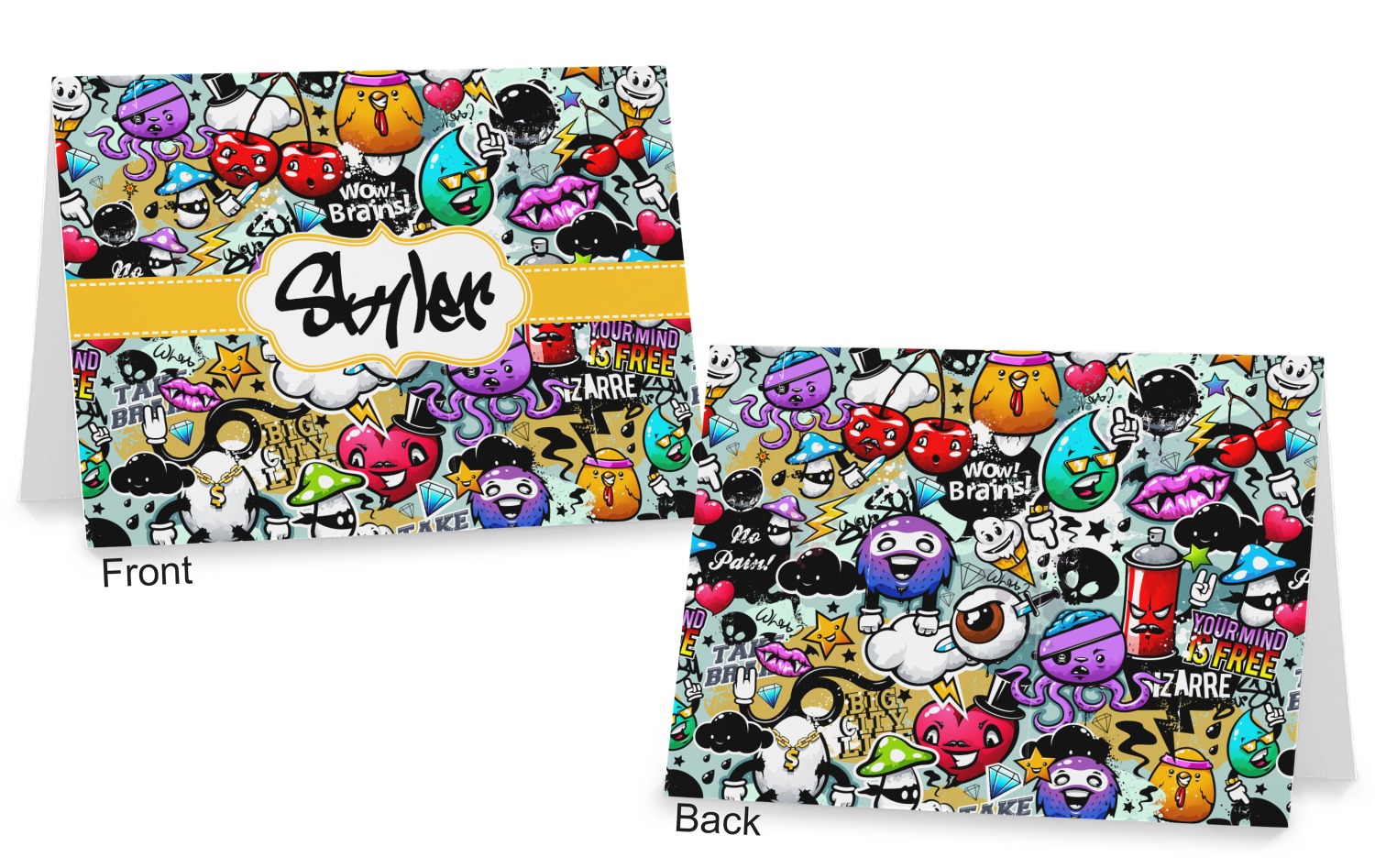 Our custom folded note cards are printed on premium 100lb. card stock and comes with white envelopes. The note card measure 5.5 by 4.25 inches and are blank on the inside for your handwritten message.