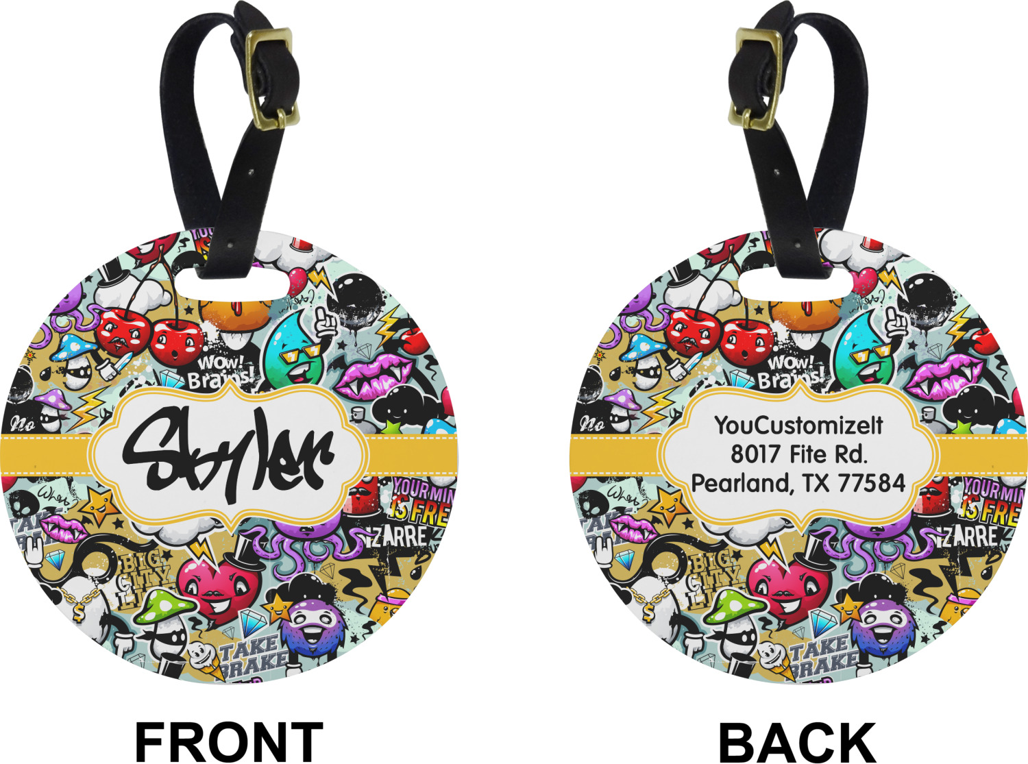 These personalized bag tags are sold in a variety of shapes, so that you may find the product that meets your vision exactly. We sell a round luggage tag, which measures at approximately 4" x 4". Our square luggage tag is about 3.5" x 3.5", while our rectangular version is 2.75" x 4 ".