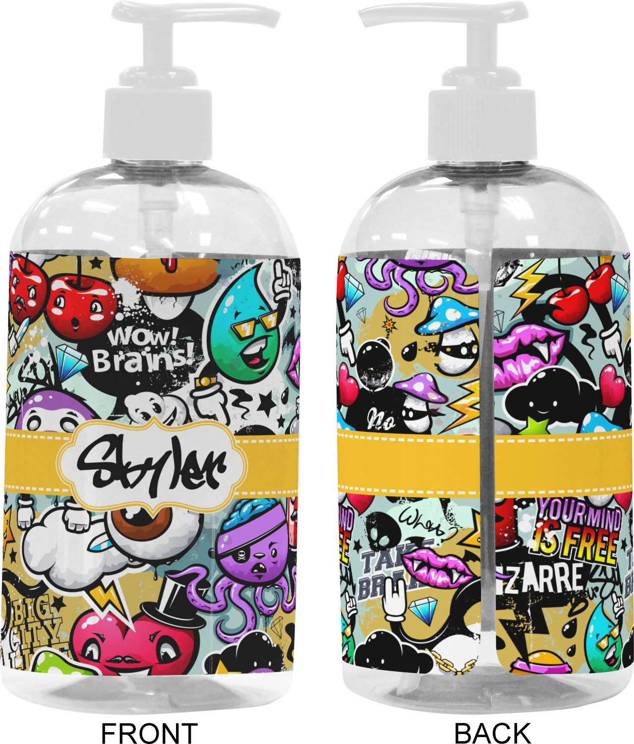 We adhere and wrap your custom printed design around the clear plastic bottle; there is a slight gap at the back for you to see the liquid level. Your design is printed on high gloss vinyl with eco-solvent inks and completely waterproof and will not fade or deteriorate over time. The vinyl is machine cut and adhered by hand to the clear plastic bottle.