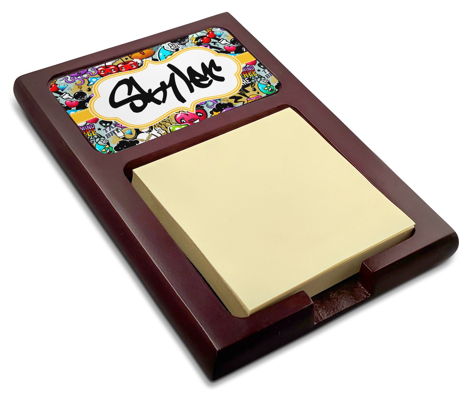 Crafted from a fine mahogany, this post it note holder is in the shade of a dark, cherry color. The dispenser itself is about 4.25 by 6.25 by 0.75 inches. You can place your 3 by 3 inch sticky notes in the indentation below the nameplate. We print your customization onto the nameplate that rests above the velvety indentation.