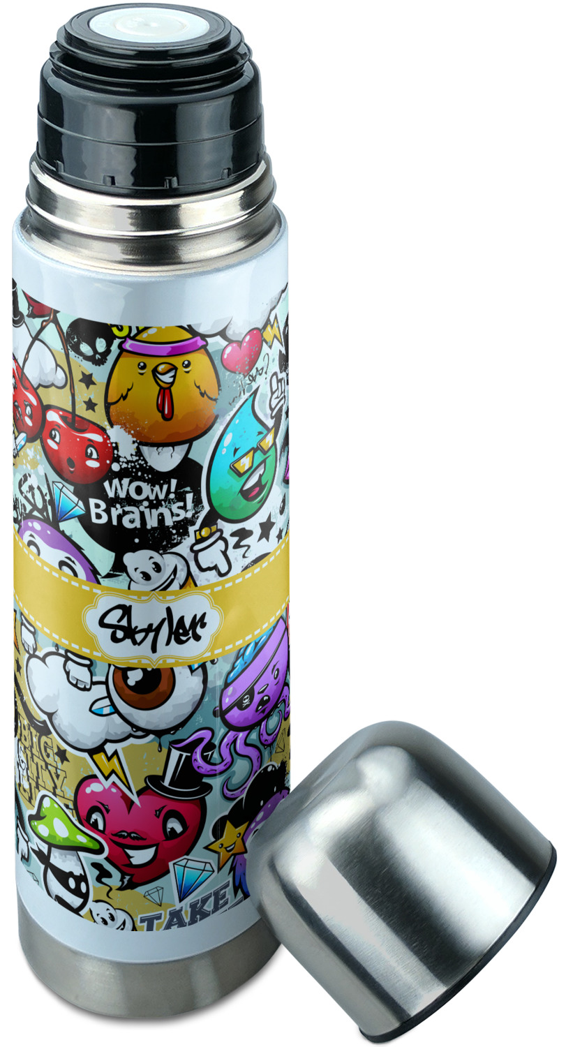 Manufactured from stainless steel, this thermos is built durably and double-walled insulated to preserve the temperature of your drink for hours. It also features a screw off lid that is made to also function as a small cup. Upon unscrewing this part of the thermos bottle, a pop-open, pour feature emerges. This feature allows you to slowly pour your beverage into your lid, ensuring a steady, controlled pour into your lid or other cup. With a capacity of 25 ounces, these large thermoses can hold several servings of your favorite beverage. Your customization is displayed all around the bottle with bright, vibrant color.