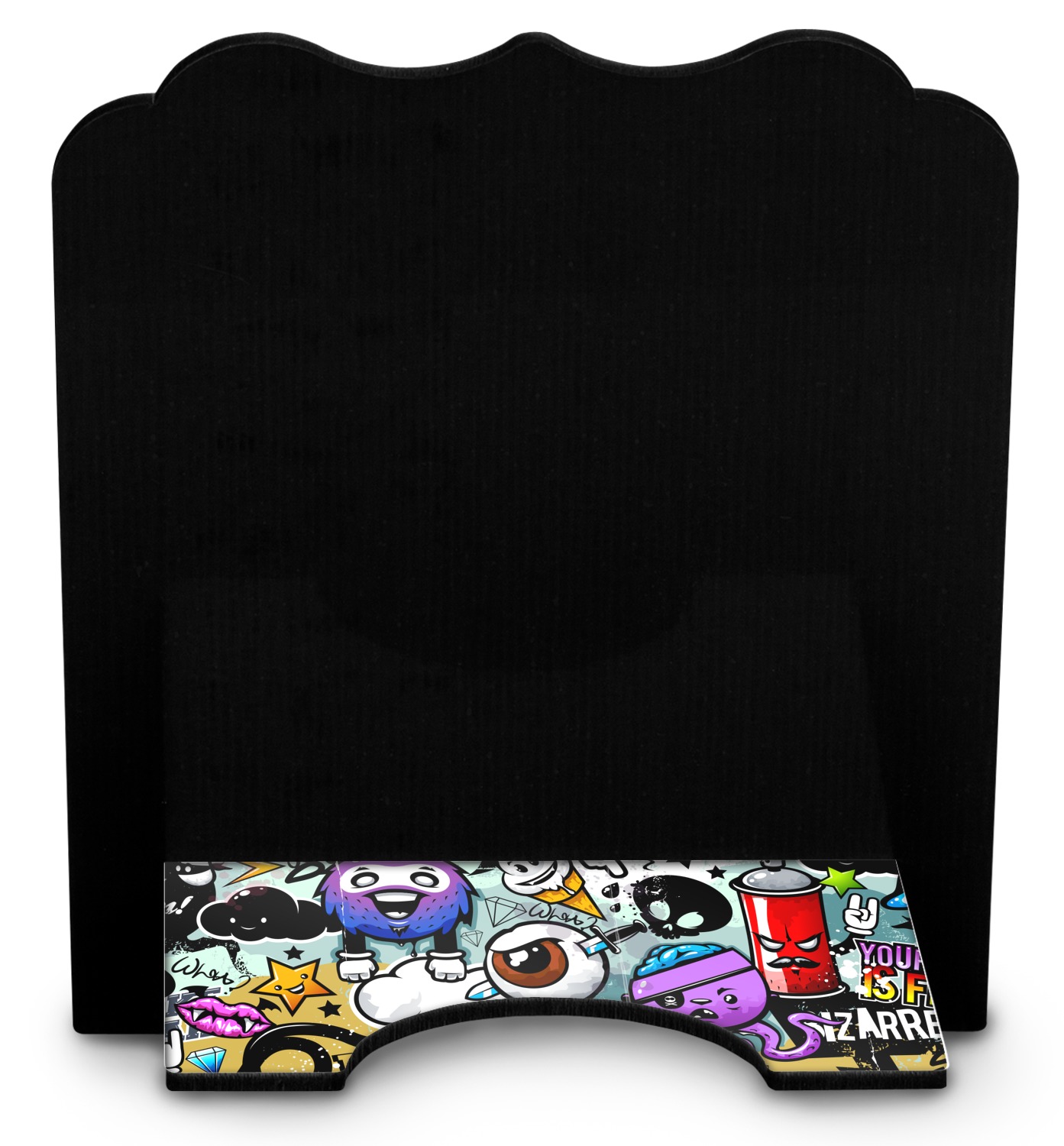 The stand is comprised of two hardboard pieces that fit snugly together and stabilize one another. The bottom part of the iPad stand supports your tablet, and has space for your tablets charger while in use. At 9.25" x 11.5", this tablet mount can support a device between the sizes of the iPad Pro and the iPad Mini 2. The uppermost part of the stand features a decorative, curved edge for a classy, suave appearance. We print your customization atop the face of the stand, in vibrant color. The remaining sides are colored a sleek black.