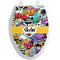 We sell these toilet lid decals in two different shapes to accommodate a wider range of toilet seat shapes. The first shape is our standard, round size, which measures at 13.5 by 12 inches. Our second option is an elongated shape, suited for long toilet seat covers. It measures 15 by 12 inches.