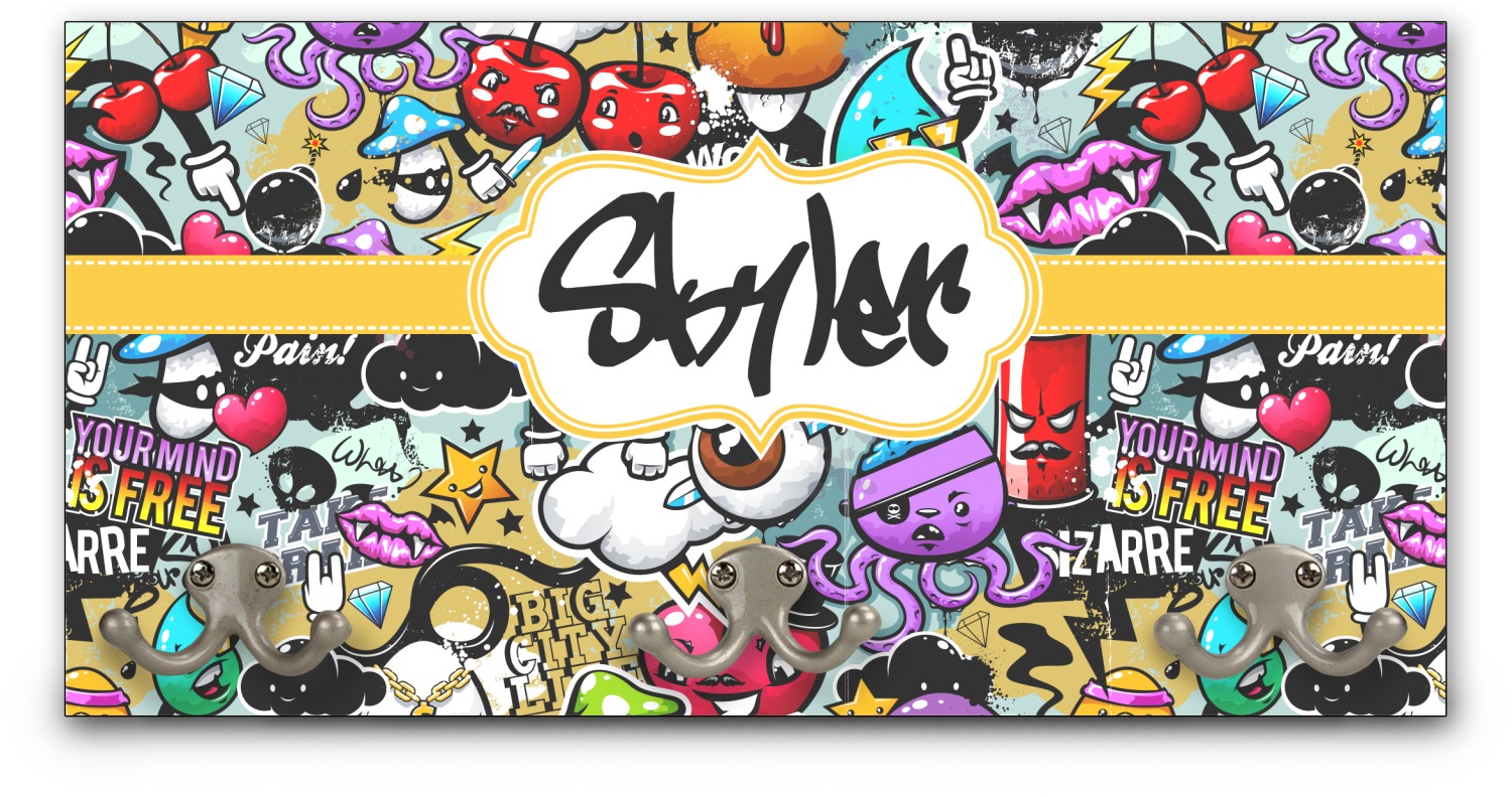 This coat rack is the perfect way to add some personality to your wall or entryway. The board is made of a strong maple that is approximately 16" x 8". The three 2-prong hooks are a sturdy metal that have three screws attaching them to the board. Your design is printed right onto the front of the board while the back and sides are a simple black.