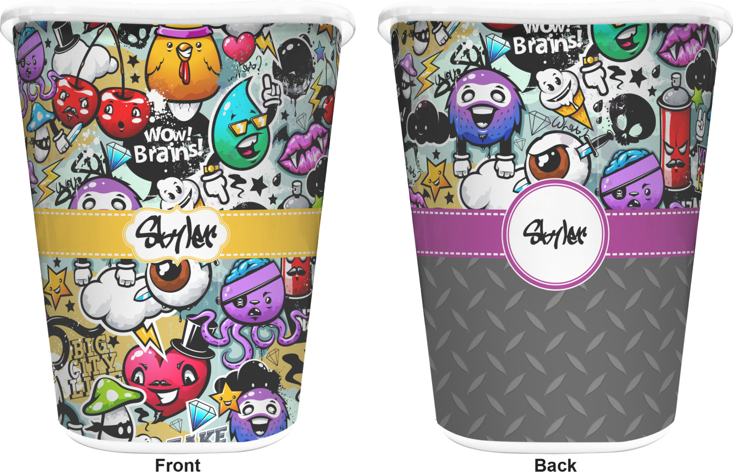 You can choose to purchase these decorative wastebaskets in either a white or a black color that will show on the base and the upper rim. Your customization is printed on a high-gloss, fine-quality vinyl adhesive, and you can choose to either have this adhesive applied to one side only or to both sides. As such, this plastic wastebasket can be single-sided or double-sided, depending on your creative vision. Your customization is printed using durable inks, making the design waterproof and resistant to fading over time.
