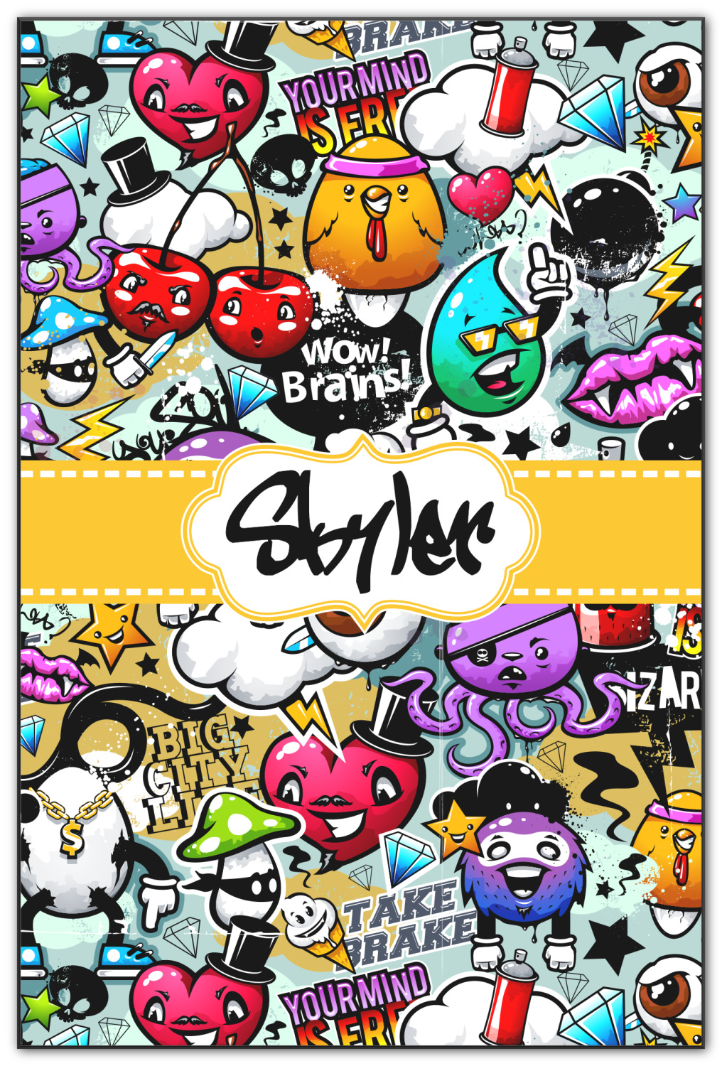 To personalized this design, we have added a ribbon with stitching along with a decorative label for your own text or name in a graffiti font!