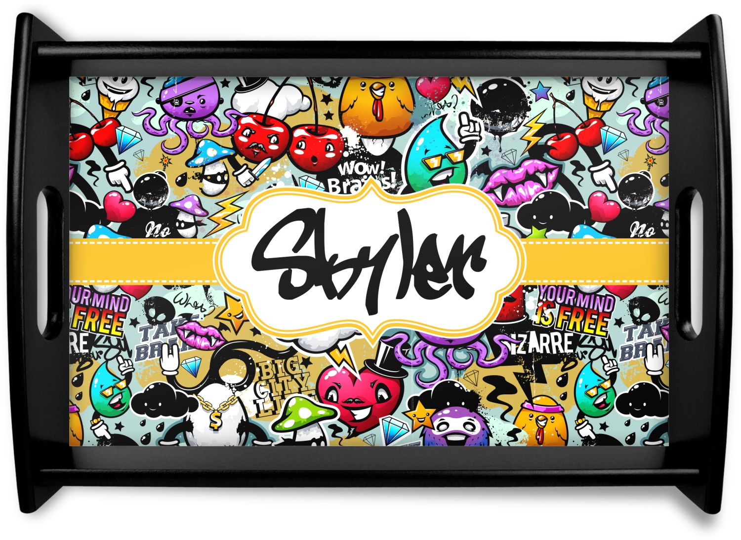 This serving tray with handles features square edges and two rounded sides, creating a very modern look. Each side is fabricated from a beautifully cut, natural wood. The bottom of the interior of the tray displays your customized design in bright, vibrant color. The tray is sold in both a black color and a natural wood look. Each variation of the wood serving tray has two sizes: Small, which is 14" x 10" x 2.25", and Large, which is 19.5" x 13.5" x 2.75".