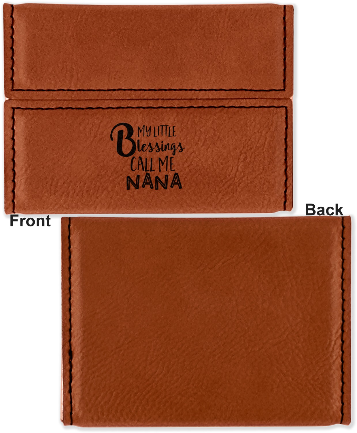 Your personalized design is laser engraved onto either the front, or the front and back of the card holder, depending on the model you purchase. Once engraved, the design will appear a darkened black against the cognac color of the leatherette.