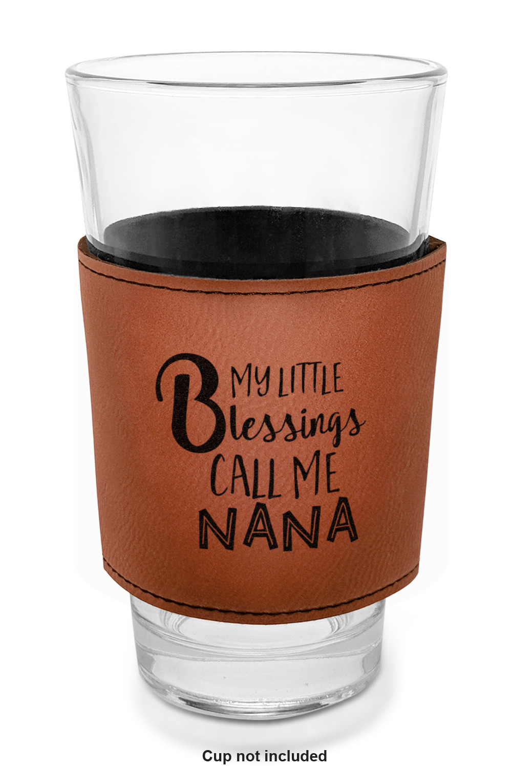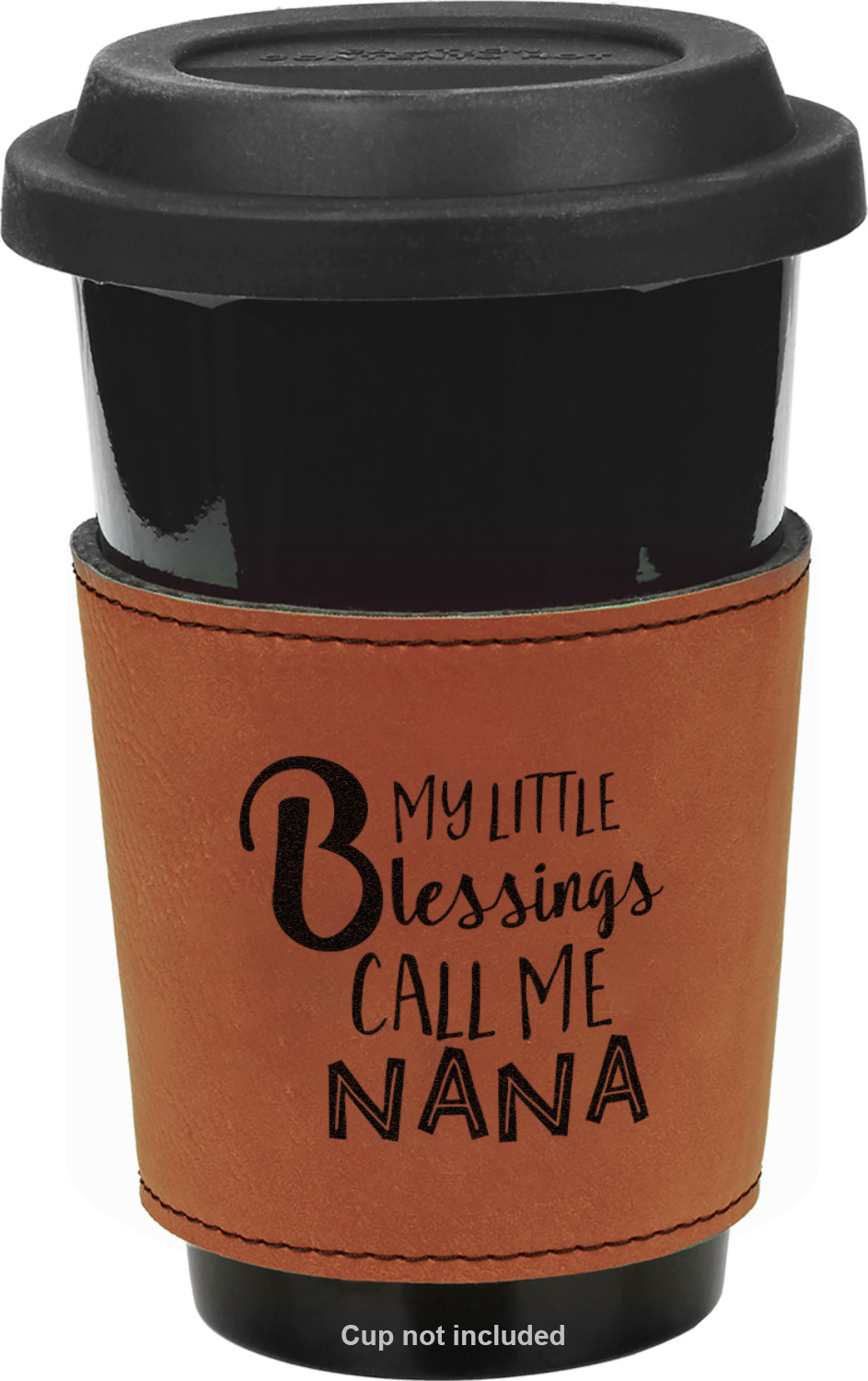 This cup sleeve is made from a suave, cognac-brown leatherette and finished with an intricate, black stitch. The interior of this can sleeve is fabricated from a thin foam material to help insulate your mug's contents. The sleeve is specifically made to suit tapered glasses or mugs, so the top's diameter is 3.5 inches, while the bottom's diameter is 2.75 inches. Your customized design will be laser engraved into the leatherette, leaving behind crisp, black imprint. With these products, we provide you with the option of engraving the front and back, or the front only.
