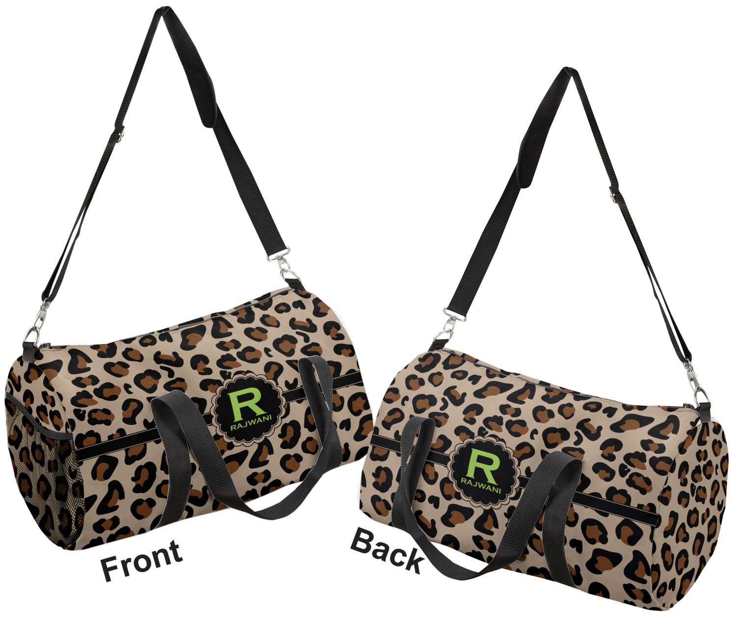 This duffle is a sturdy bag made of a canvas material. It comes in two sizes: Small (19"W x 9.5"H x 9.5"D) and Large (23"W x 12"H x 12"D). The bag is a cylindrical shape with a black adjustable strap and two handles. On one side is an elastic pouch to put a waterbottle or other small item. Your product will be sublimated with your design and is able to be designed on the front, back, and sides. Be sure to remember that the straps may cut into parts of your design if you upload your own artwork.