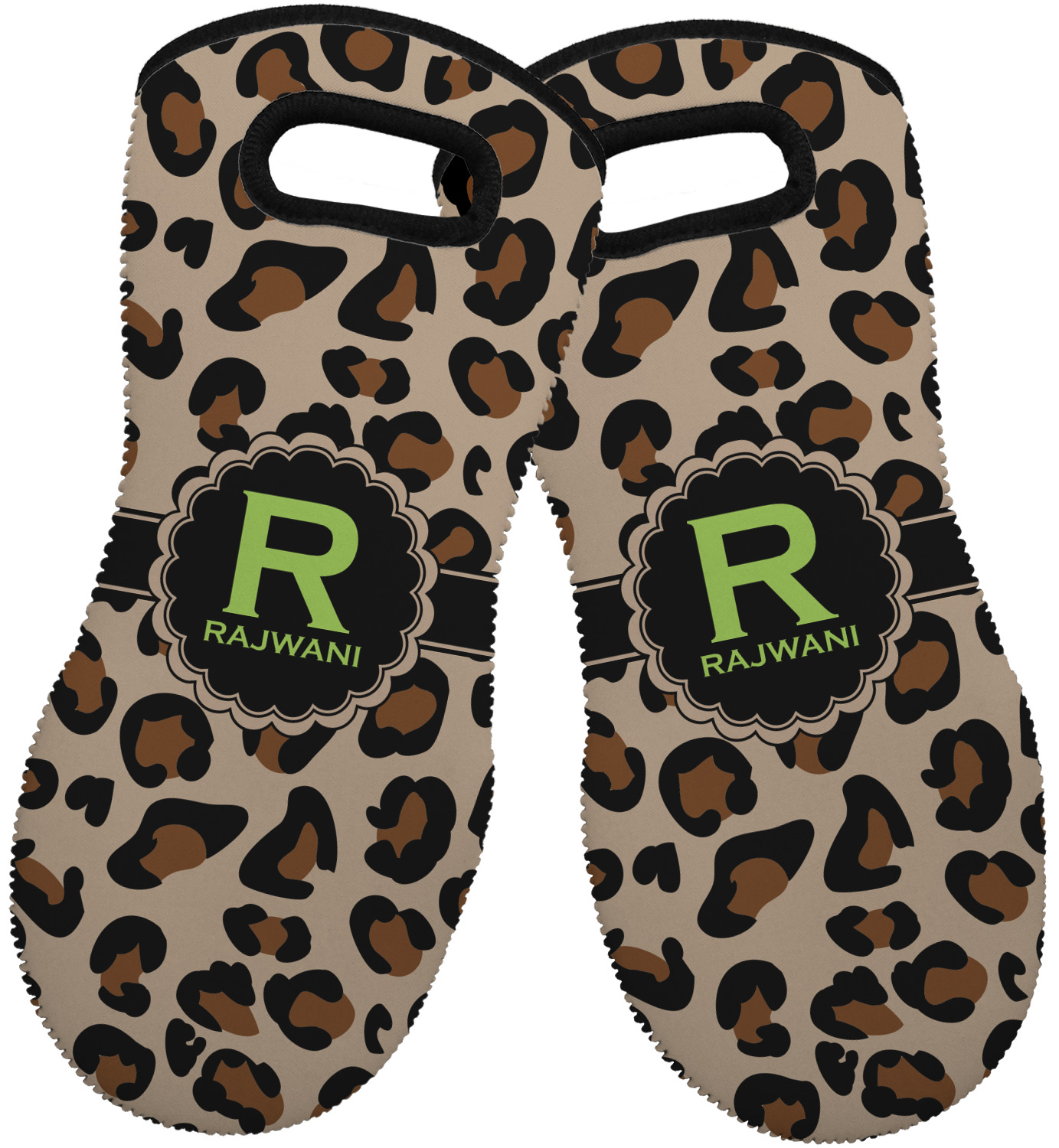 These heat resistant gloves are made entirely of a durable neoprene; the front features a softer texture, while the palm's side has a textured surface, meant to handle heat up to 500 degrees Fahrenheit. Thick, heavy duty stitching connects the two sides. A small, oval cutout appears on the front, and can be used to hang and store the mitt. Your personalization appears on the front, and the upper part of the back of the mitt. The style of these oven mitts are suitable for both the right and left hand, depending on your needs. If you need one for each hand, be sure to order two!