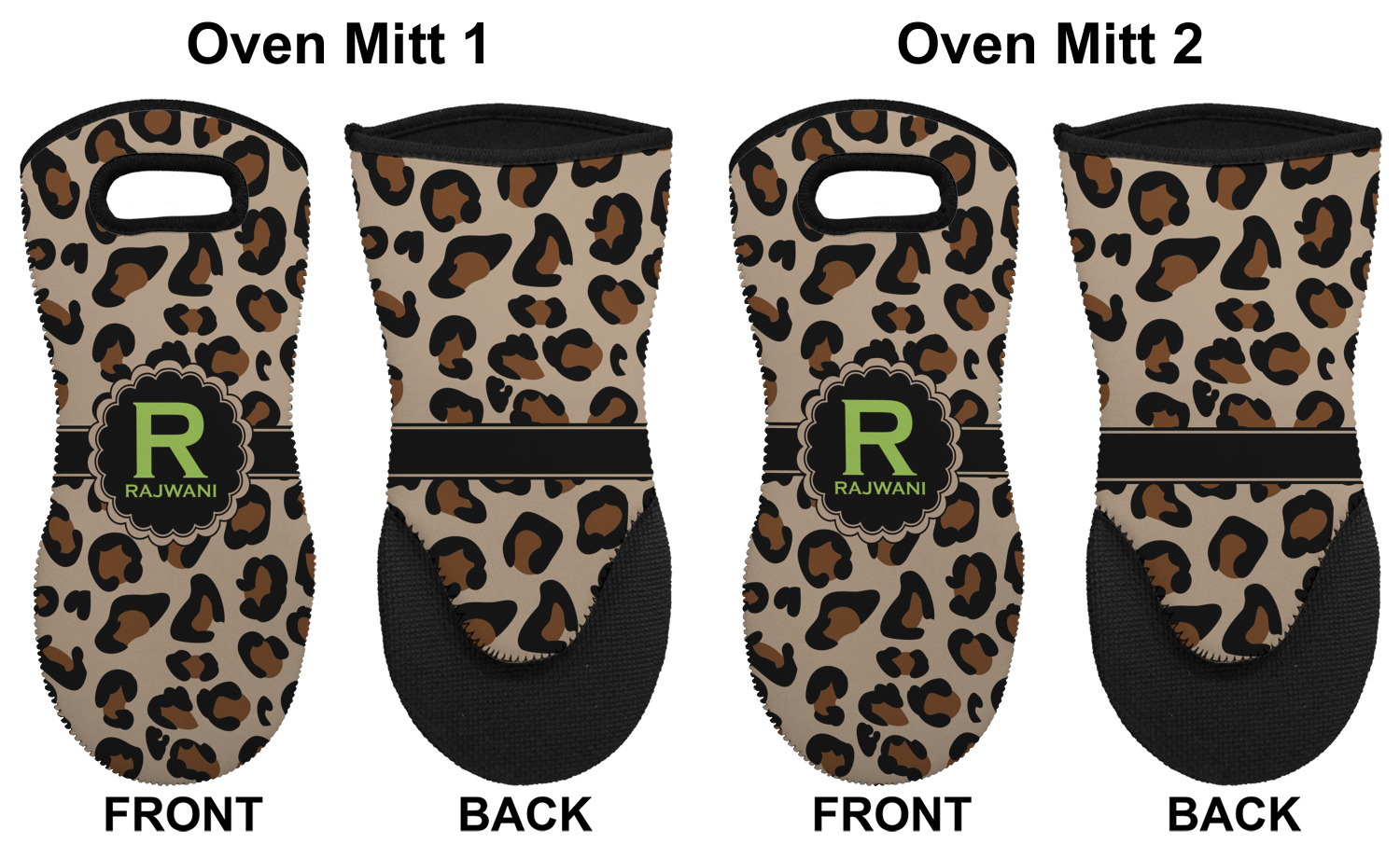 These heat resistant gloves are made entirely of a durable neoprene; the front features a softer texture, while the palm's side has a textured surface, meant to handle heat up to 500 degrees Fahrenheit. Thick, heavy duty stitching connects the two sides. A small, oval cutout appears on the front, and can be used to hang and store the mitt. Your personalization appears on the front, and the upper part of the back of the mitt. The style of these oven mitts are suitable for both the right and left hand, depending on your needs. If you need one for each hand, be sure to order two!
