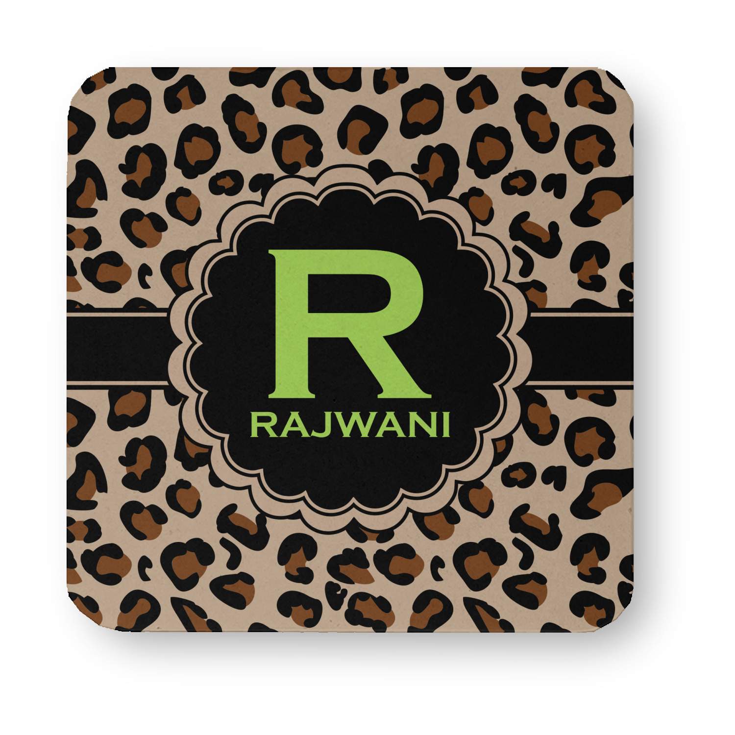 A wide black band trimmed in tan complete this design. A black scalloped circle outlined in tan highlight the personalization of your choice.