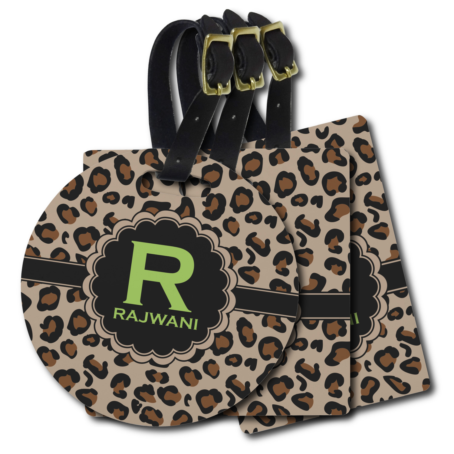 These personalized bag tags are sold in a variety of shapes, so that you may find the product that meets your vision exactly. We sell a round luggage tag, which measures at approximately 4" x 4". Our square luggage tag is about 3.5" x 3.5", while our rectangular version is 2.75" x 4 ".