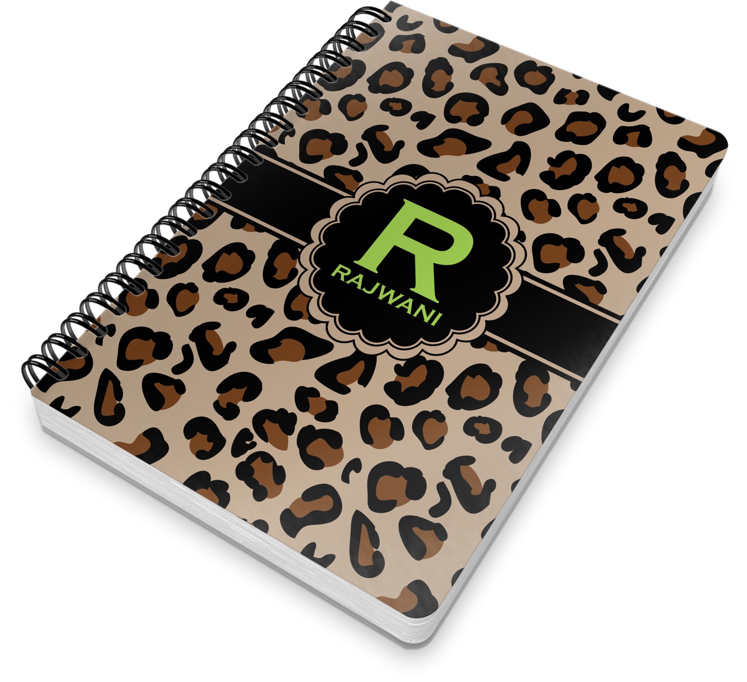This spiral notebook includes 75 sheets of thick, ruled paper. The front and back of this custom notebook is made of a robust, laminate, plastic covering. We print your personalization on these two panels, underneath a glossy finish, which emphasizes the colors of your design. The two panels and the sheets of paper are held together by a sturdy, black coil. The paper within your bound notebook is perforated for easy, clean tearing.