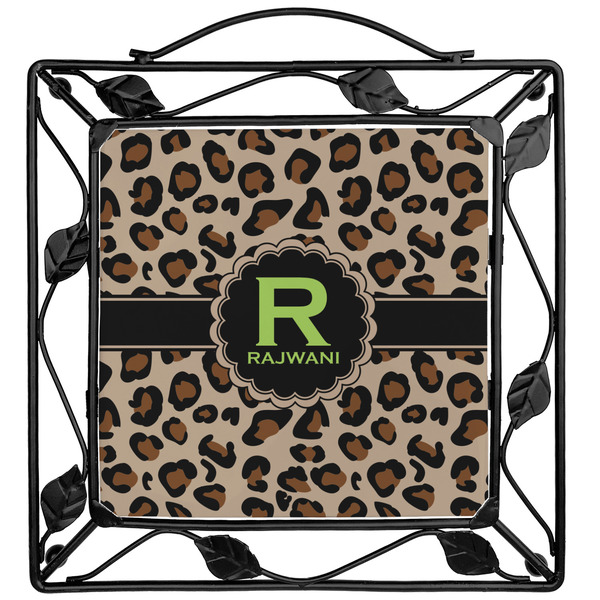 Our square trivets are made from a durable, wrought iron. This model features 4 small half circles, one on each corner, and a larger ring of iron that circles the central, customized tile. Each of the 4 corners has a round foot on its bottom for stability. This trivet is 8.75 by 8.75 inches, but the central tile measures at 6 inches on both sides.