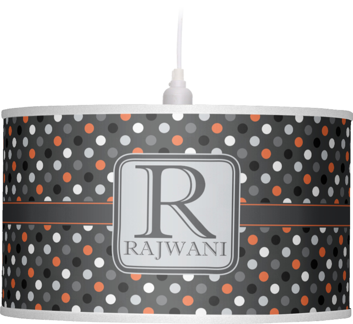 Polka dots have grown up and are not just for kids anymore. We have taken a pattern that is normally for children and by adding a modern color scheme have created a very versatile design that can be used for both adults and children. The polka dot design is set on a background of charcoal gray. Using coordinating colors of light gray, black, white, and orange create a very modern take on the timeless polka dot pattern.