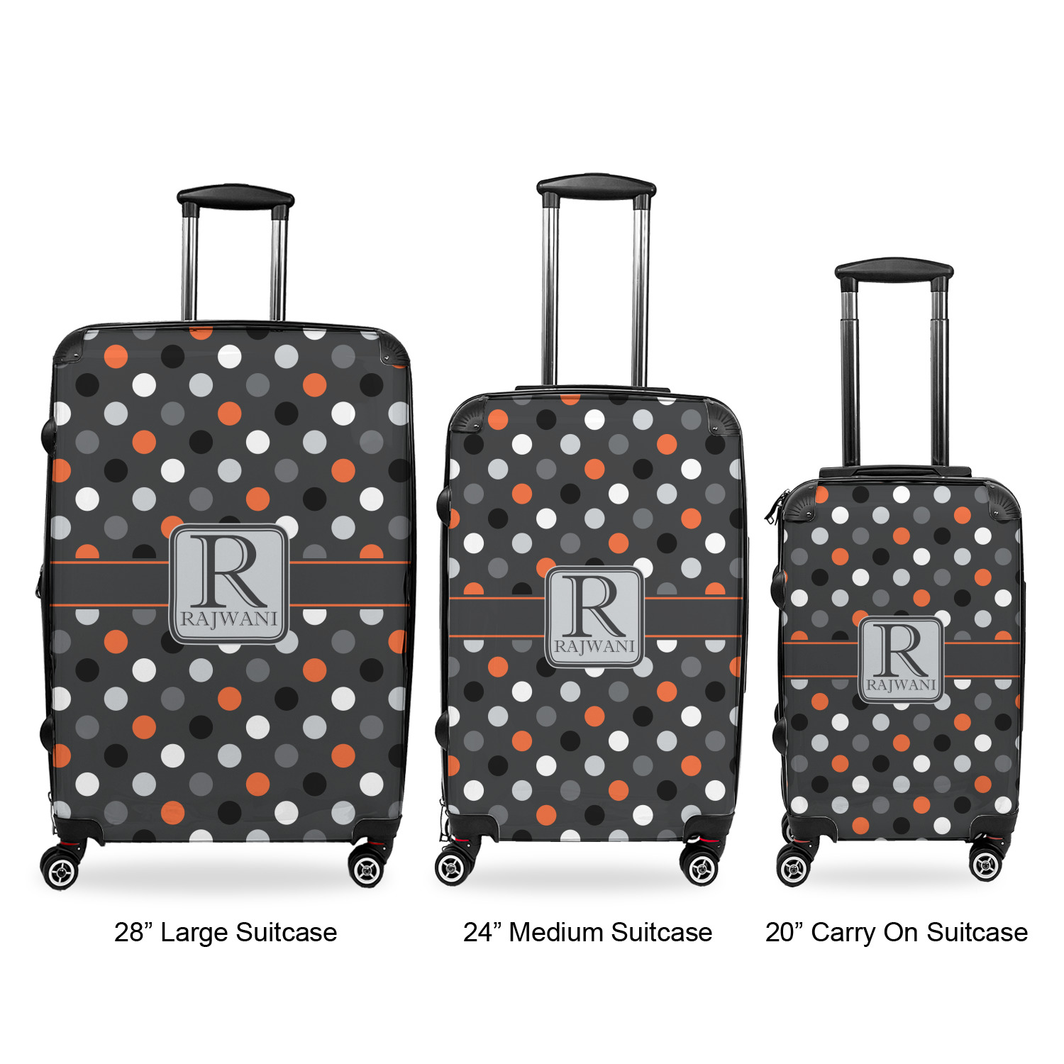 Your suitcases will be personalized on the front, while the back and sides are a sleek charcoal color. On the side opposite of the side handle there are rubber feet to allow it to safely lay on its side on a luggage belt. These are a lightweight hard shell luggage option that will fit just about anyone's needs. The sizes and weights of each suitcase are below: