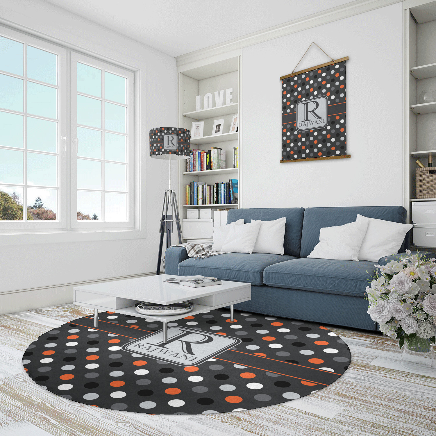 Polka dots have grown up and are not just for kids anymore. We have taken a pattern that is normally for children and by adding a modern color scheme have created a very versatile design that can be used for both adults and children. The polka dot design is set on a background of charcoal gray. Using coordinating colors of light gray, black, white, and orange create a very modern take on the timeless polka dot pattern.