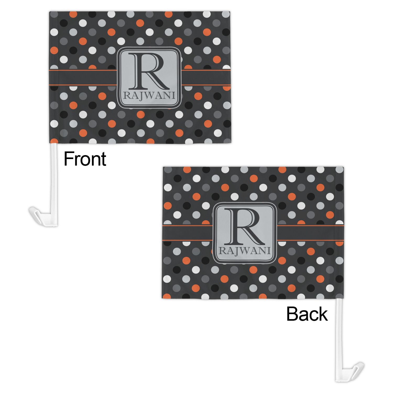 Our personalized flags are made from a durable, yet lightweight cloth that will proudly bear your logo or design of choice, while withstanding the outside elements. We have two size options - 8" x 11" and 11" x 15". Both come with a flag pole which includes a clip that secures the pole to the side window, whether it is rolled up or down. The flags are printed on both sides to display your design from all directions.