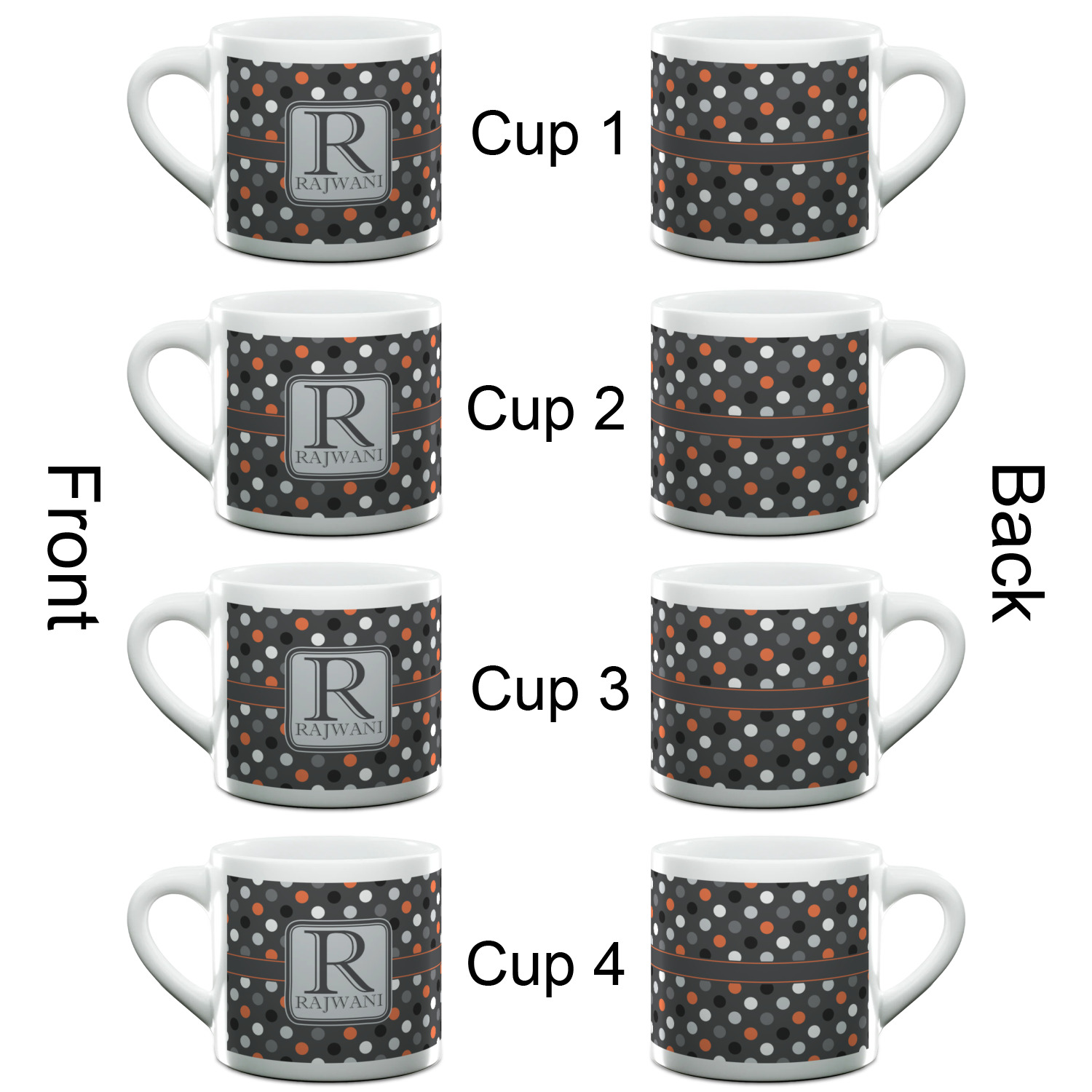 Each of our espresso mugs is a ceramic material sure to keep your drink warm. Personalize one cup for yourself, or order a set of 4! Its the perfect little gift for any coffee lover! We carry two sizes for you to personalize - 3 oz. (approx. 3.25" x 2.325" x 2.625") or 6 oz. (approx. 4" x 2.9" x 2.9"). Our 3 oz. mug is perfect for that single shot espresso while our 6 oz. mug can be your next favorite cappuccino cup holding two shots of espresso!