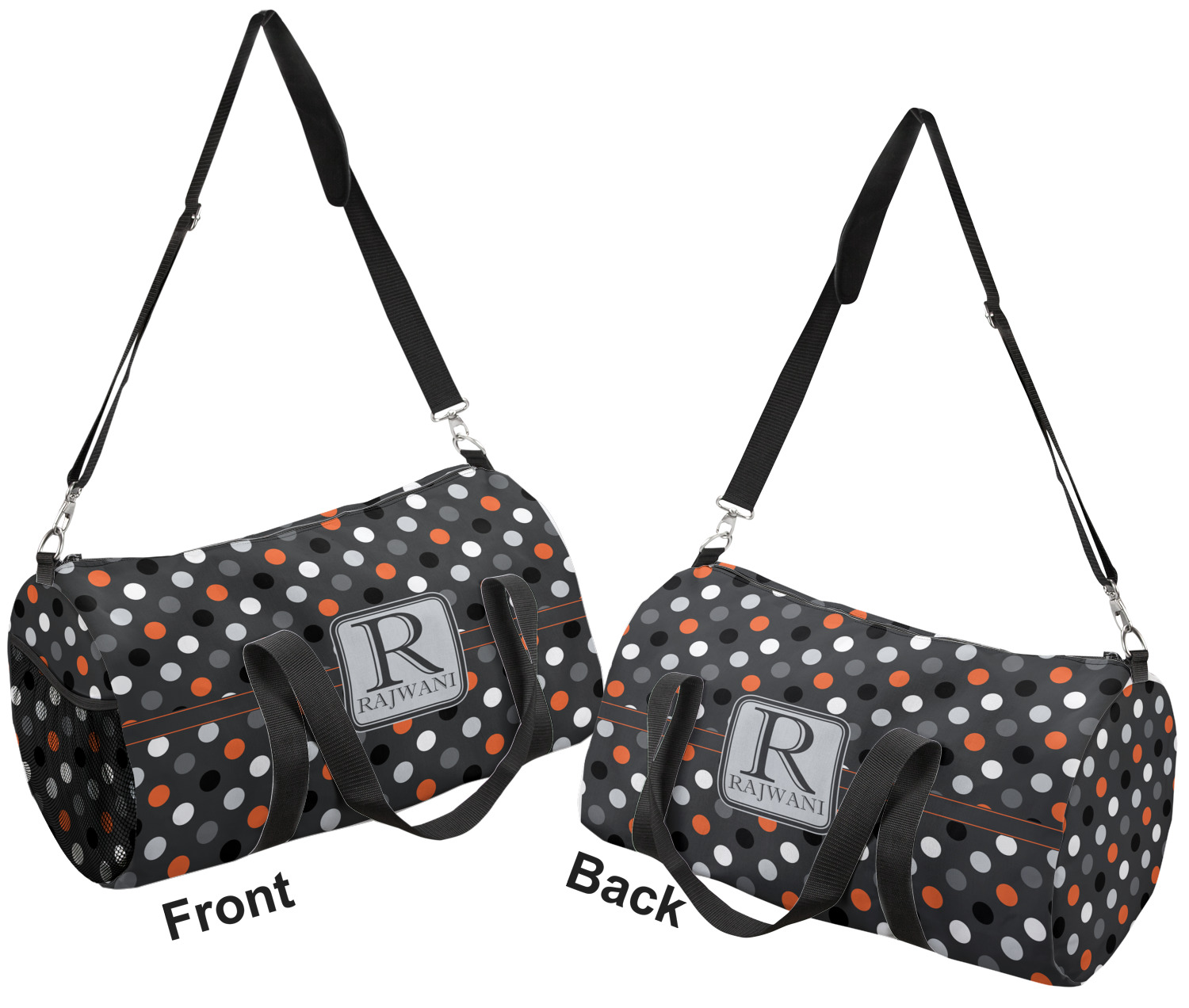This duffle is a sturdy bag made of a canvas material. It comes in two sizes: Small (19"W x 9.5"H x 9.5"D) and Large (23"W x 12"H x 12"D). The bag is a cylindrical shape with a black adjustable strap and two handles. On one side is an elastic pouch to put a waterbottle or other small item. Your product will be sublimated with your design and is able to be designed on the front, back, and sides. Be sure to remember that the straps may cut into parts of your design if you upload your own artwork.
