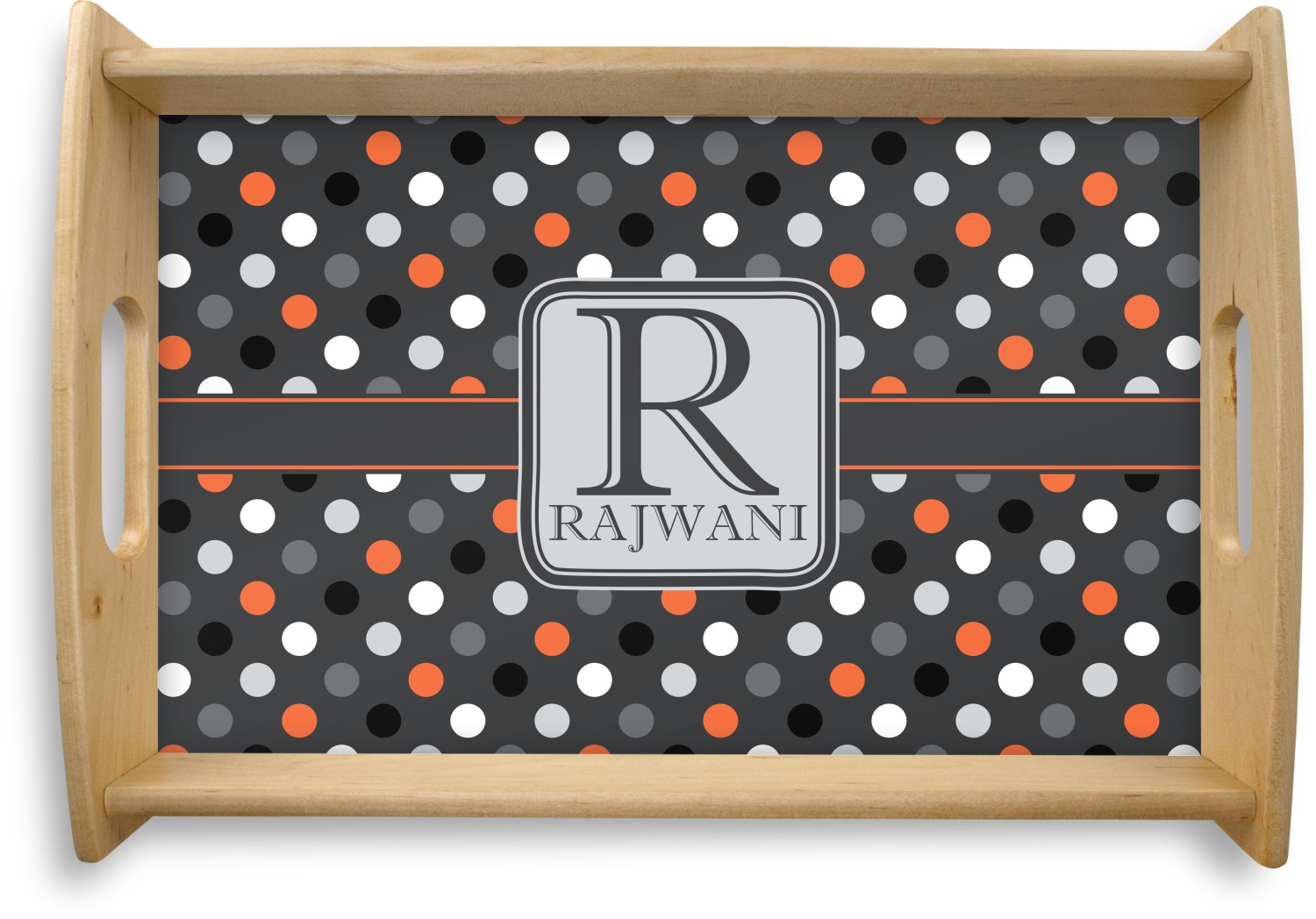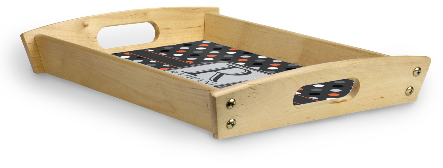 This serving tray with handles features square edges and two rounded sides, creating a very modern look. Each side is fabricated from a beautifully cut, natural wood. The bottom of the interior of the tray displays your customized design in bright, vibrant color. The tray is sold in both a black color and a natural wood look. Each variation of the wood serving tray has two sizes: Small, which is 14" x 10" x 2.25", and Large, which is 19.5" x 13.5" x 2.75".