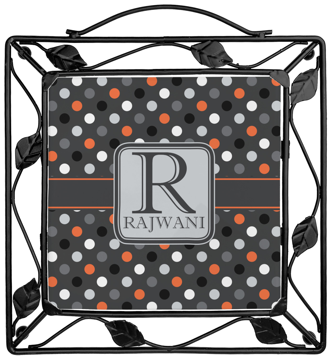 Our square trivets are made from a durable, wrought iron. This model features 4 small half circles, one on each corner, and a larger ring of iron that circles the central, customized tile. Each of the 4 corners has a round foot on its bottom for stability. This trivet is 8.75 by 8.75 inches, but the central tile measures at 6 inches on both sides.