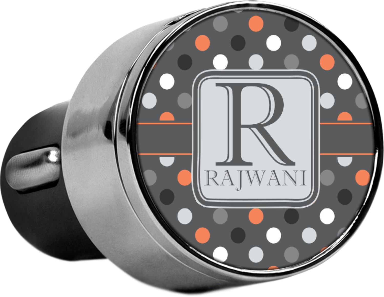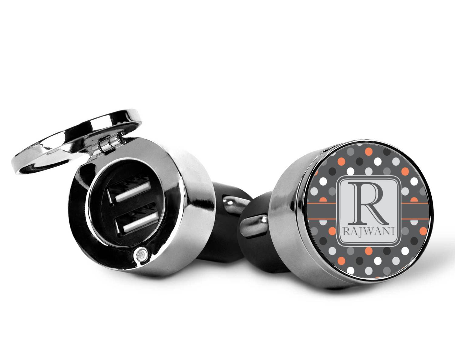 This car charger adapter converts your cars bland cigarette lighter into a decorative, personalized, and operational USB charging port. Made of solid, silver-plated metal, these chargers feature a flip-open lid that both displays your customized design and conceals two USB ports. The metal lid of the USB car charger adapter is 1.5" in diameter and seals due to a small, ingrained magnet on both the charger and its lid. The cigarette lighter insert, itself, is colored black.