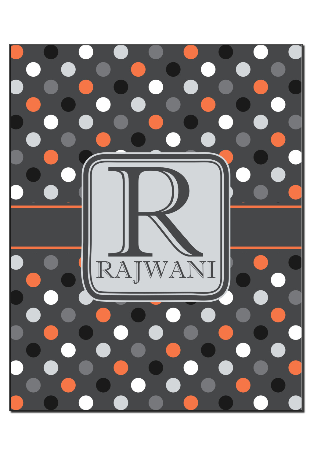 Polka dots have grown up and are not just for kids anymore. We have taken a pattern that is normally for children and by adding a modern color scheme have created a very versatile design that can be used for both adults and children. The polka dot design is set on a background of charcoal gray. Using coordinating colors of light gray, black, white, and orange create a very modern take on the timeless polka dot pattern.