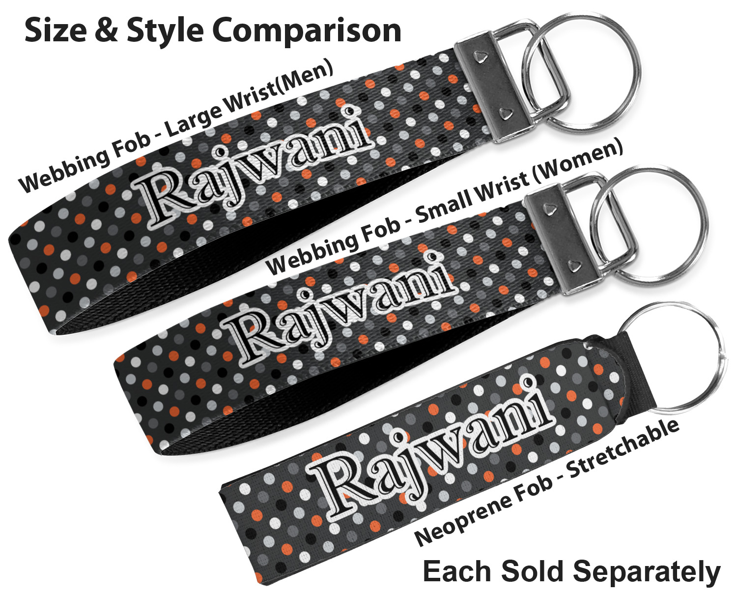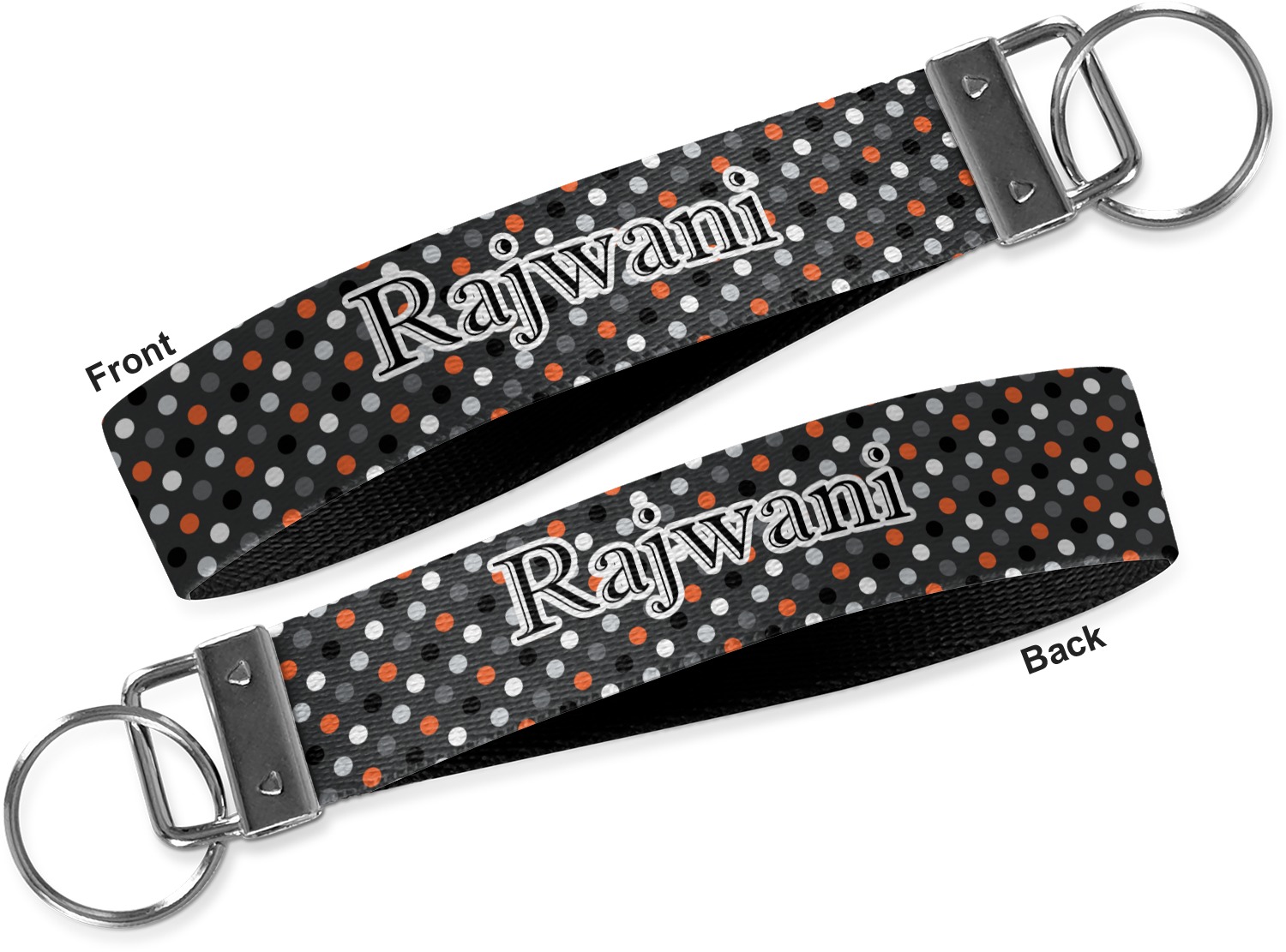 These key fob keychains are made from a polyester weave, right here in the USA. They feature a silver, metal clasp, attached to a round keyring. The piece gives the personalized wristlet a beautiful, finished look. Your customized design is printed on the outside of the keychain strap. We carry these wristlets in two sizes: small, which is 5 inches in width, and large, which is 5.5 inches in width.