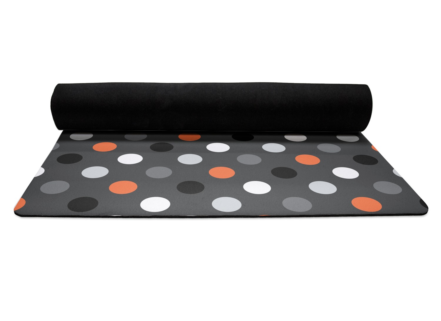 Polka dots have grown up and are not just for kids anymore. We have taken a pattern that is normally for children and by adding a modern color scheme have created a very versatile design that can be used for both adults and children. The polka dot design is set on a background of charcoal gray. Using coordinating colors of light gray, black, white, and orange create a very modern take on the timeless polka dot pattern.
