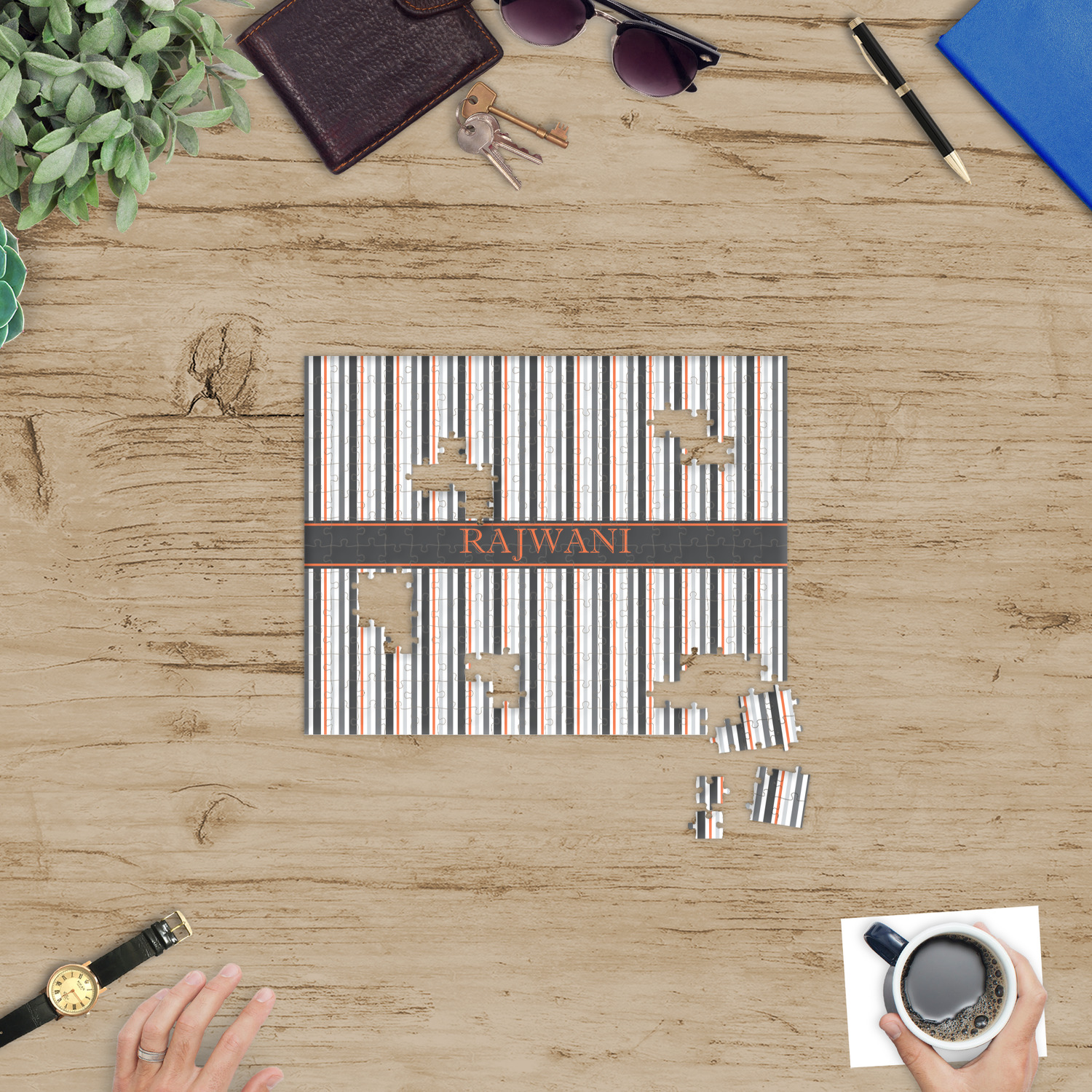 You can also upload your logo or art that you or your kids drew. To create more challenging jigsaw puzzles, you can create a pattern from with your logo or artwork. You can also add other elements such as text or personalization.