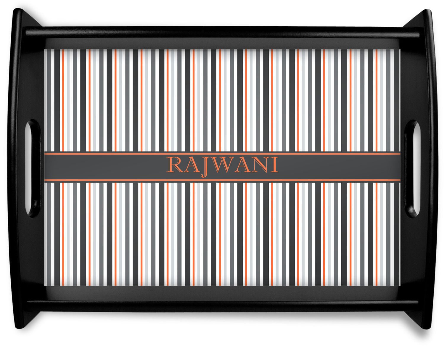 This serving tray with handles features square edges and two rounded sides, creating a very modern look. Each side is fabricated from a beautifully cut, natural wood. The bottom of the interior of the tray displays your customized design in bright, vibrant color. The tray is sold in both a black color and a natural wood look. Each variation of the wood serving tray has two sizes: Small, which is 14" x 10" x 2.25", and Large, which is 19.5" x 13.5" x 2.75".