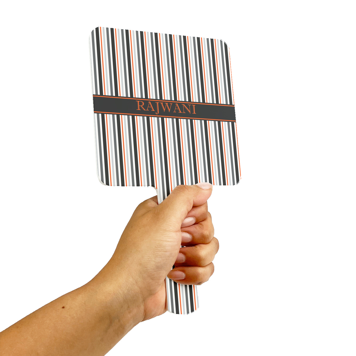 A wide band of black with a orange trim pulls the design together. This band adds a modern touch and provides the focal point for personalization of your choice.