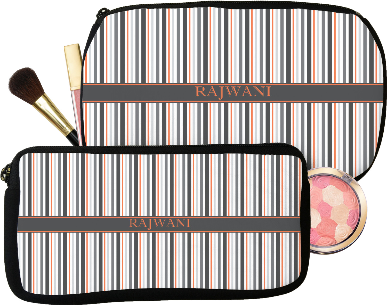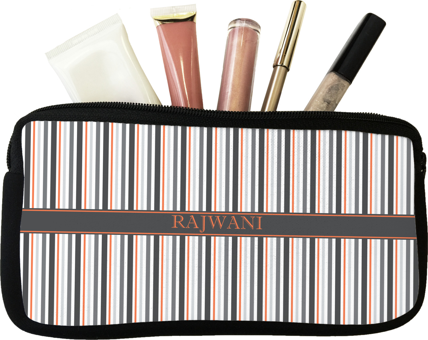 Our personalized makeup bags are available in many different designs, patterns and colors - so you are sure to find one that will love. They are made of neoprene (same material as wet-suits) and thus are water resistant, so spillages in your makeup bag will not end up all over you purse. They are customized on one side and are black on the other side and the zipper is black as well.