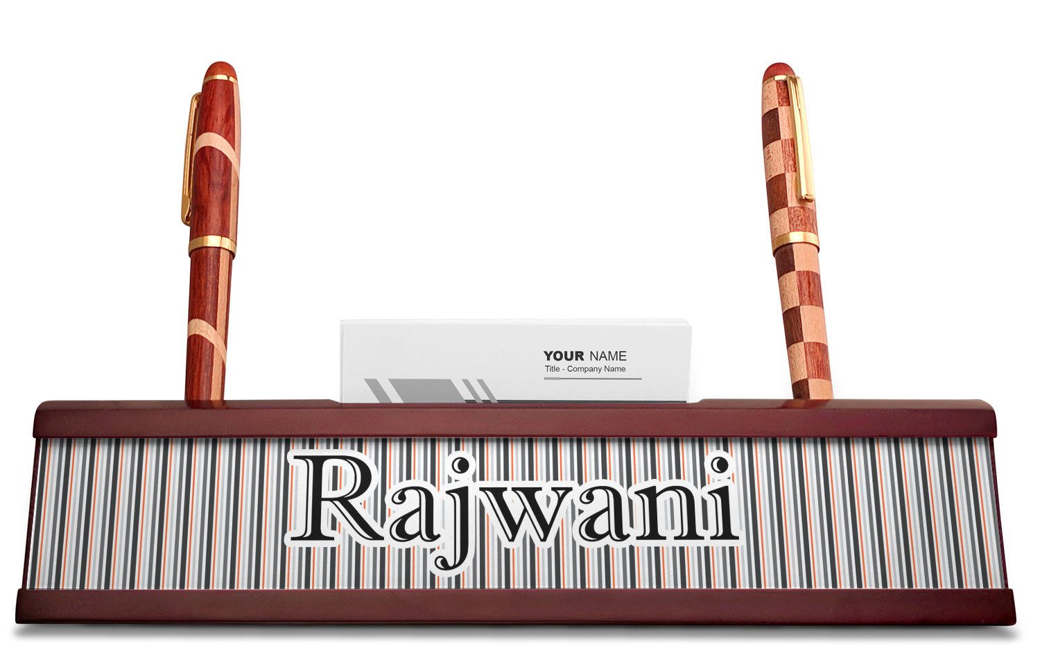 Your desk name plates are crafted from a high-quality, dark-cherry mahogany. At approximately 9.5 by 1.875 by 2.5 inches, this name plaque will fit perfectly, front and center, on your desk. Your customization spans across the entire face of the nameplate. Behind the nameplate lies a skinny slot that can fit approximately 15, traditionally-sized, business cards. You can also store your writing utensils on either side of this custom desk name plate.